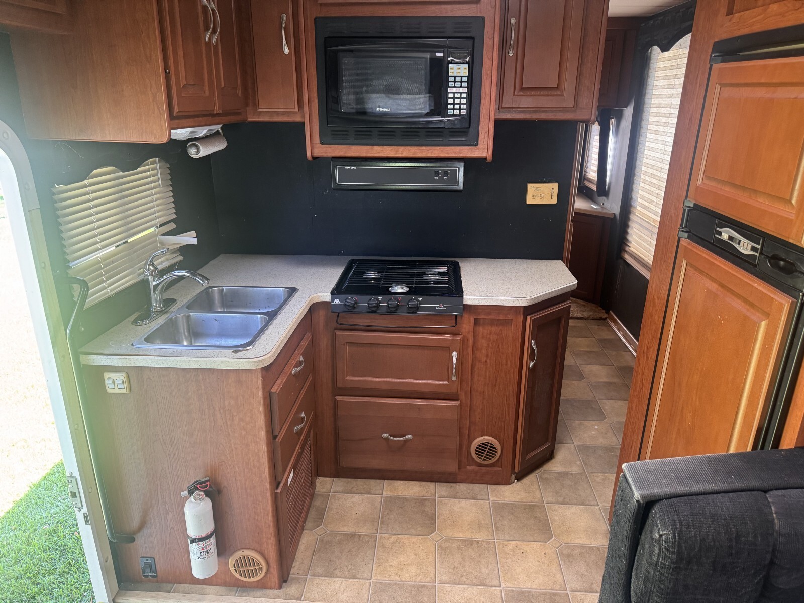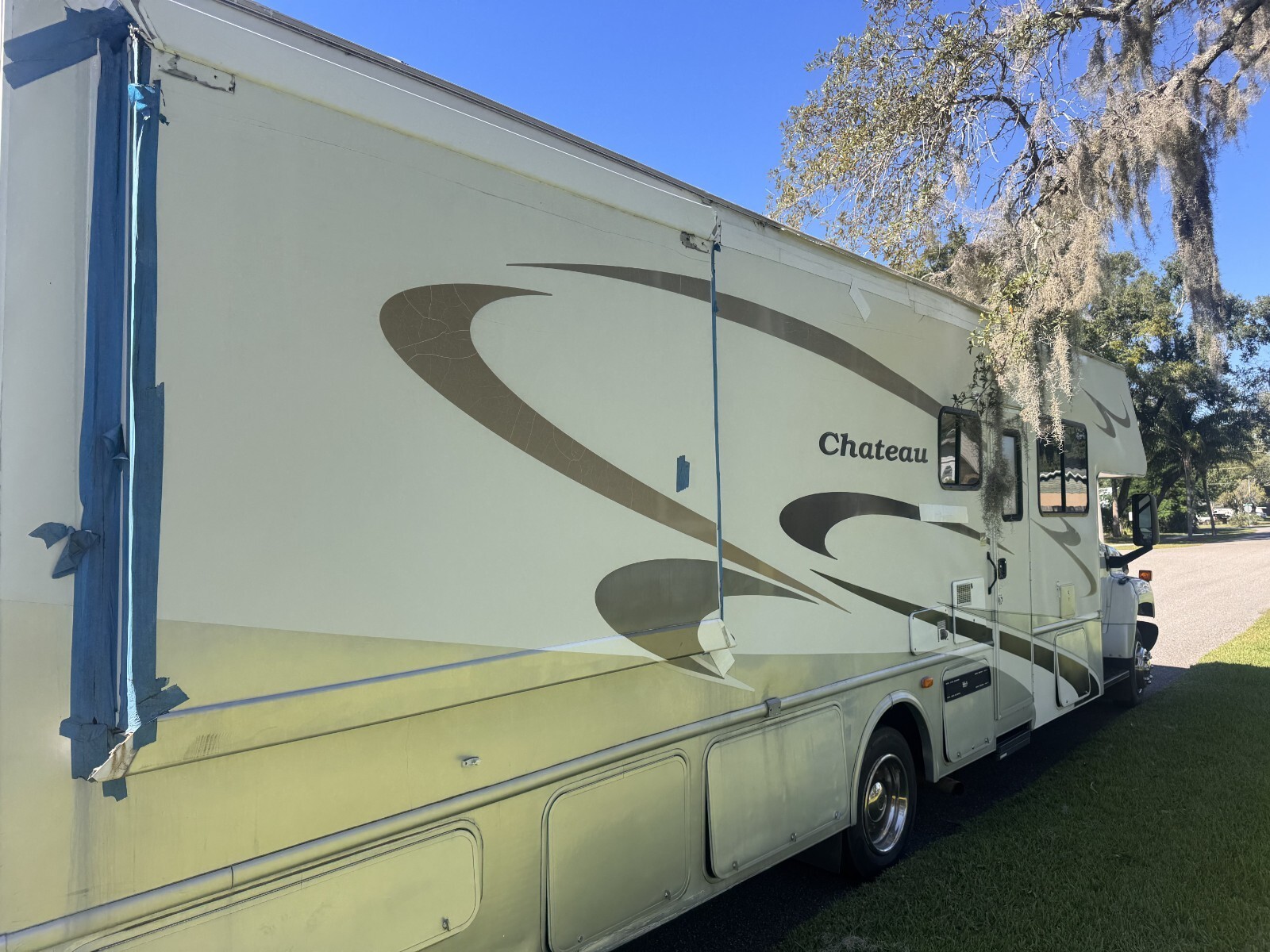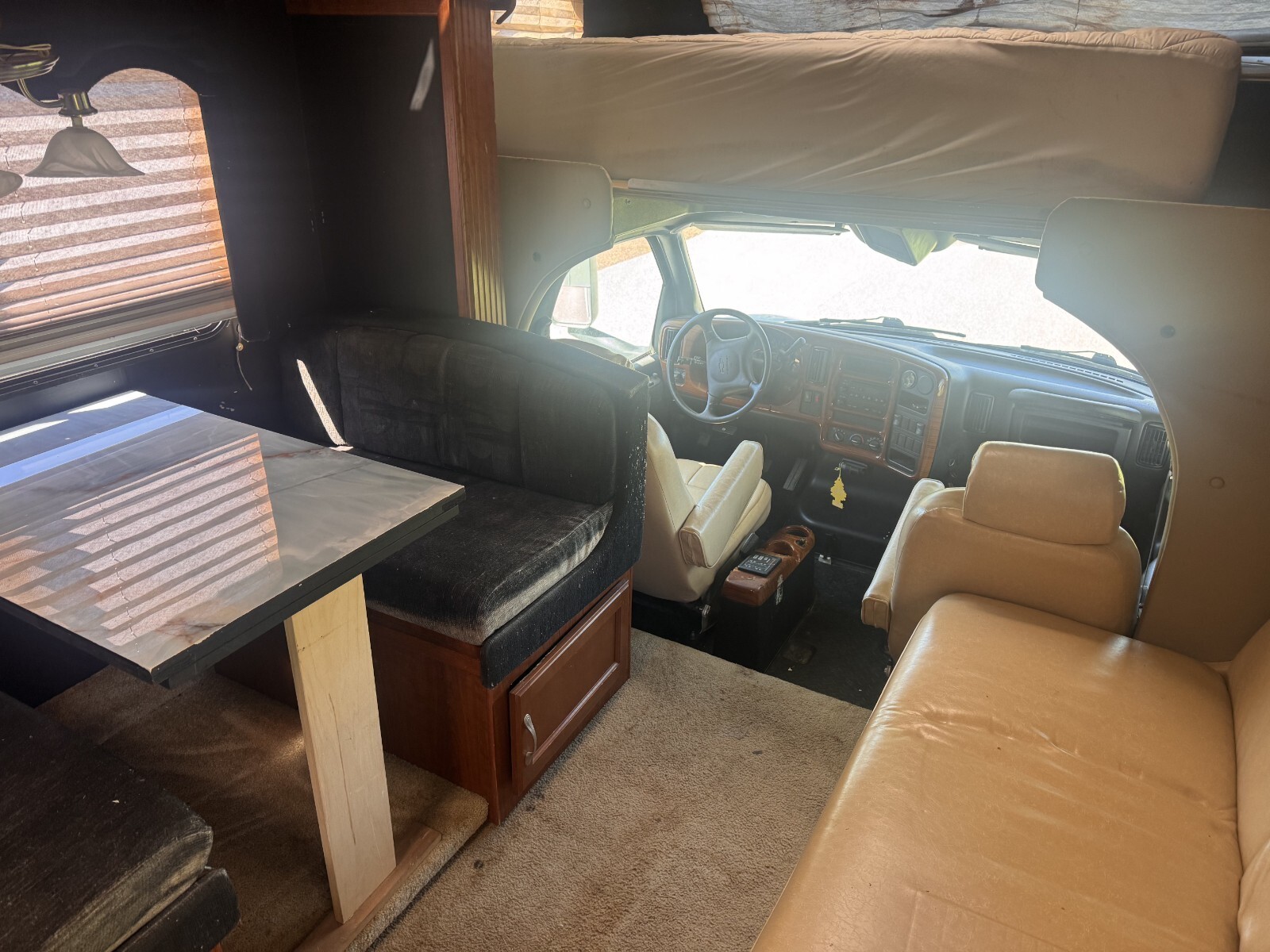 WHAT DOESN'T WORK to the best of my knowledge: The major item, and the reason I'm selling as-is, is the rear bedroom slider is stuck about 4 inches out. I began trying to fix it but stopped when I realized it was over my head, thus the waterproof tape around it in the final photo. The microwave didn't work. The coach batteries are dead. There are a couple deep scratches in the laminate on the passenger side, also taped up and visible in the final photo. A couple cabinet doors need new hinges and are hanging uneven.