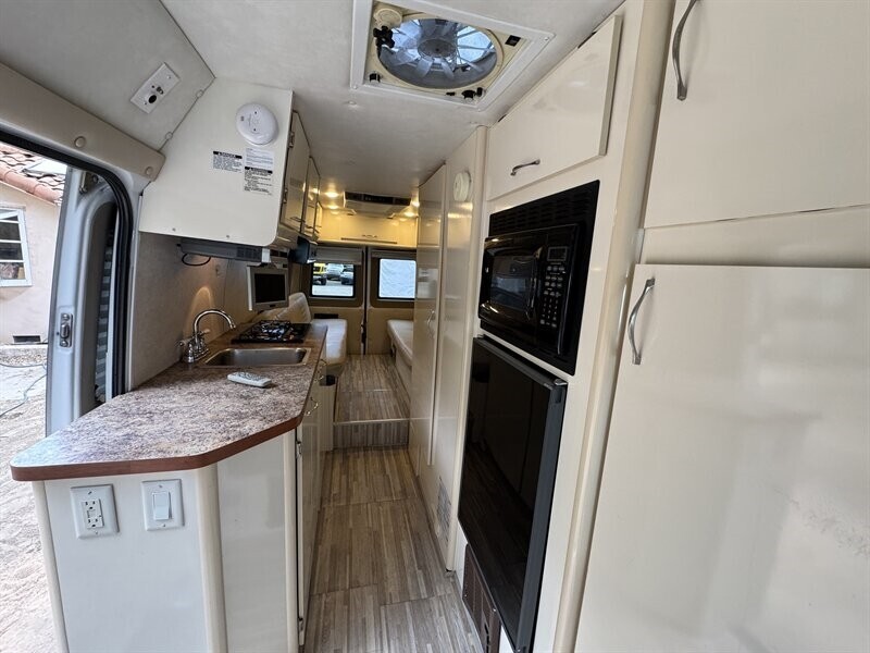 making it one of the most economical RVs in its class. Sleeps 2 comfortably, with a smart convertible bed setup, full kitchen, wet bath, and generous storage—all packed into an easy-to-park The space efficient engine bay and cab architecture maximize useable interior length. The almost vertical exterior side panels maximize interior space within an overall exterior width smaller than other full-size vans. The cab is equipped with factory “comfort seats”. On long trips, you’ll appreciate the 10-way adjustability, lumbar supports and headrests. And Mercedes-Benz quality. timeless space utilization with a few new twists. The secondary seating consists of lounge seats designed for improved comfort (but do not convert to beds) or optional captain’s seats for even greater comfort on or off the road. All four captain’s seats swivel for optimal dining, game playing or just shootin’ the breeze. The second row will even swivel towards the rear to give everyone a great view of the TV. More comfortable front sleeping is attained with our new optional folding mattresses. Stored during the day, they rest on top of the front four seats to provide longer, flat and even sleeping surfaces. When you don’t need them, just leave them at home. With no gables or cabinets at either end of the galley, it’s open from front to rear on the driver’s side. Panoramic windows from front to rear provide dayligt.