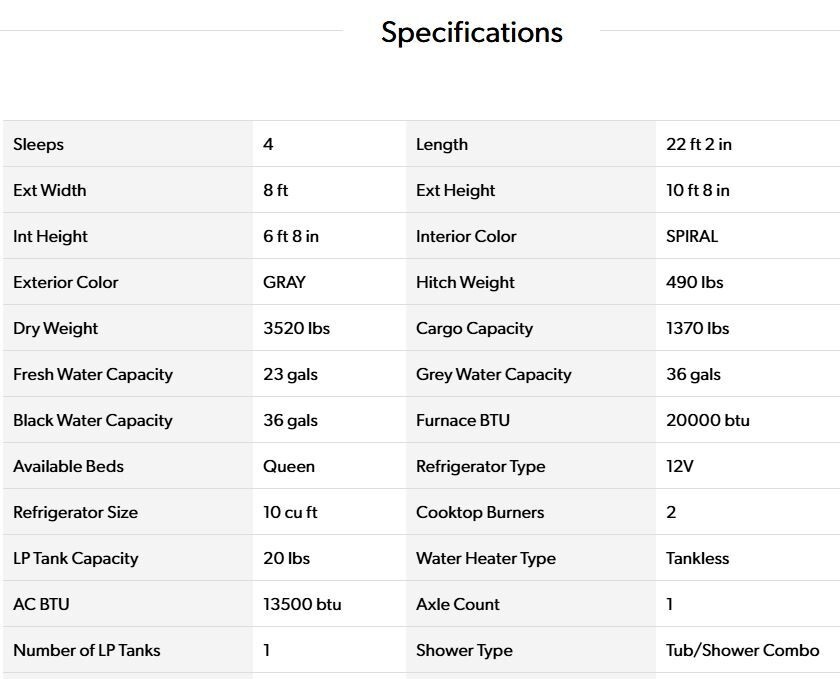 Just got this camper from insurance company due to minor damage left front as you can see. Otherwise camper look and even smell like new still.We can offer repairs if needed, but usable as you see it. Couple links below to Factory brochure and another listing we found with good specs. We will ad photos when camper arrives at our warehouse.