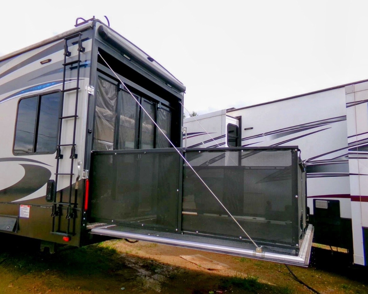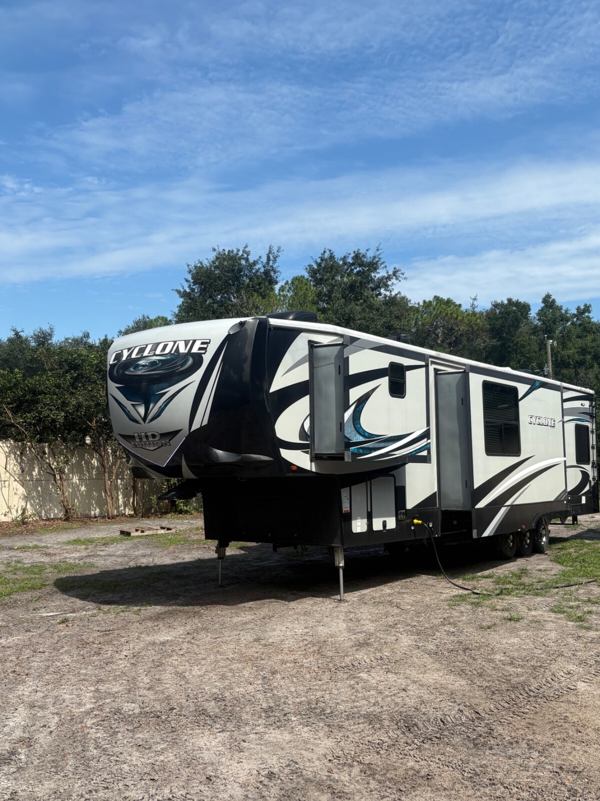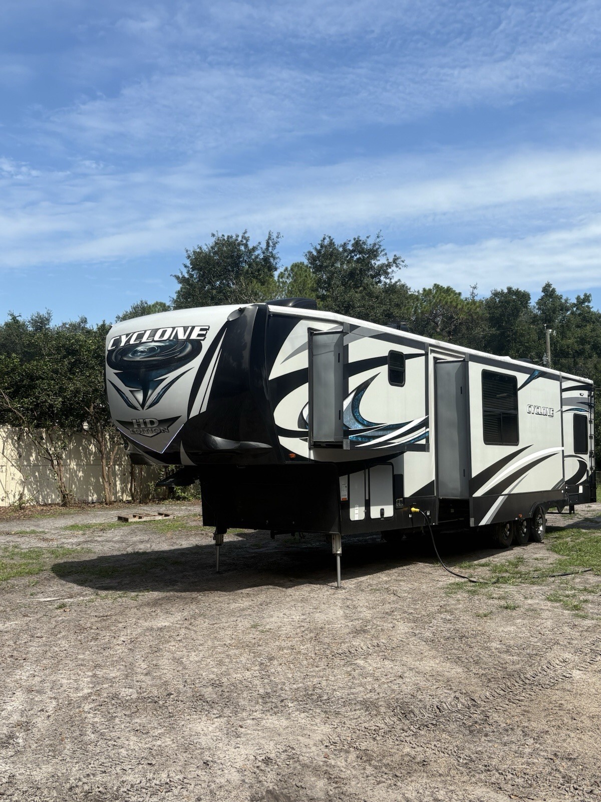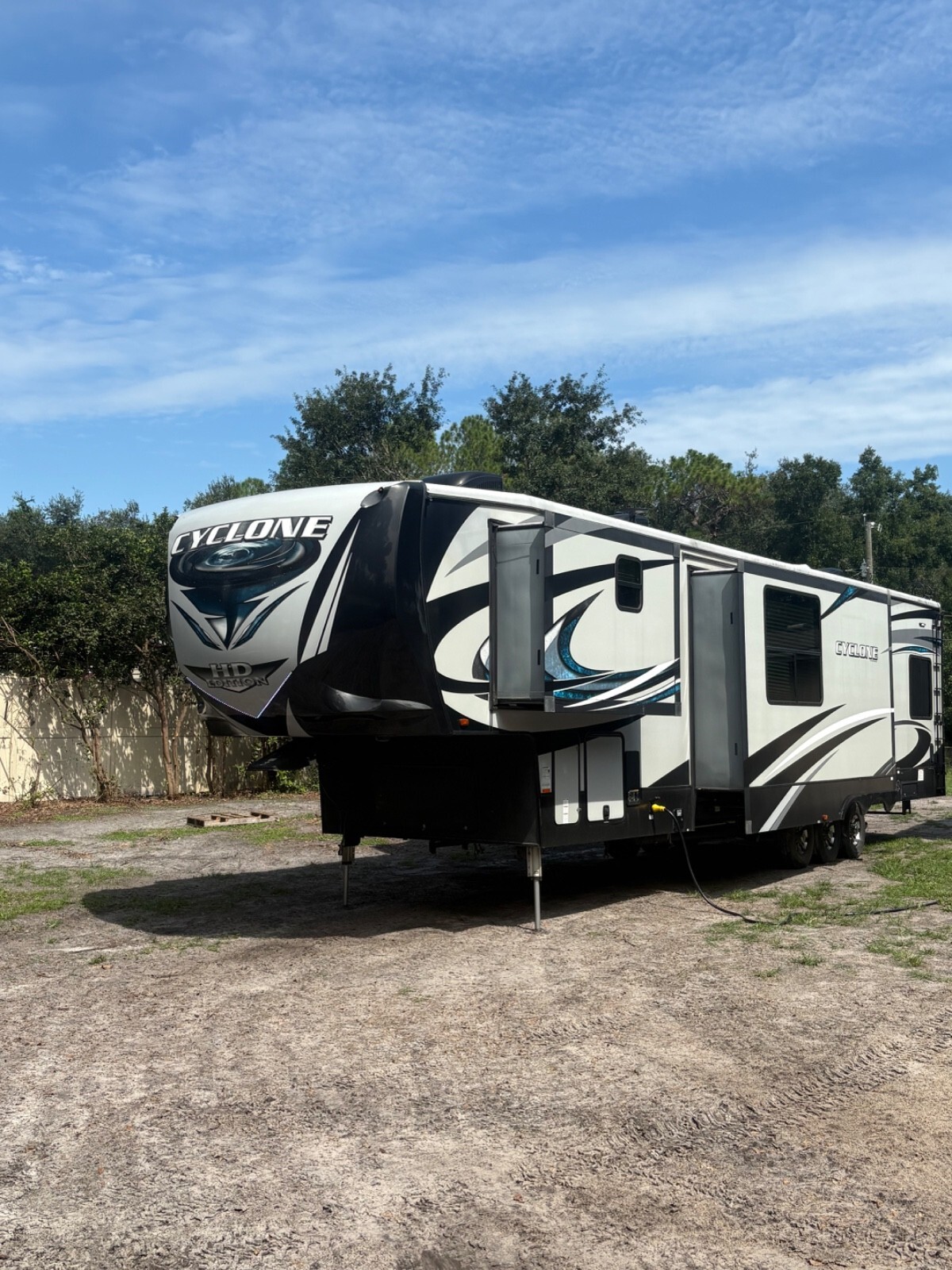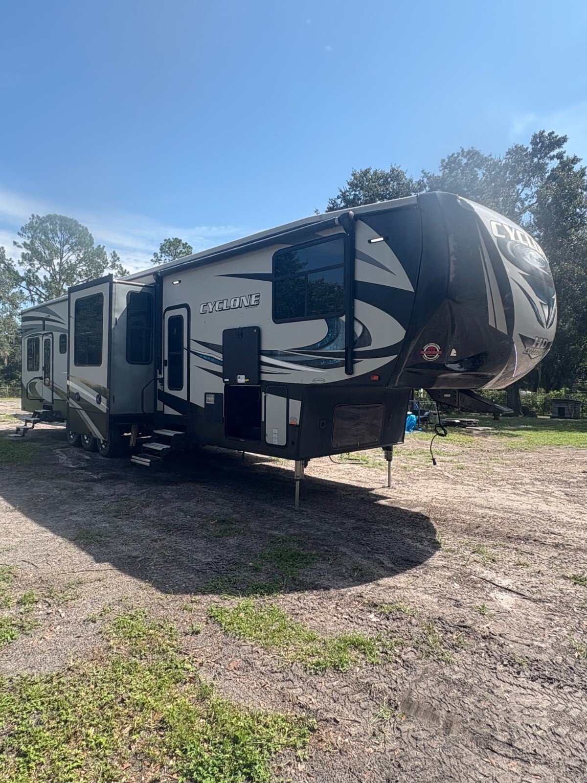 2018 Heartland Cyclone 4005, Sleeps 7-9Fifth-wheel toy hauler with a 13 GT garage, that also folds down into a deck it easily hauls ATVs, bikes, or gear, while doubling as a guest suite with dual electric queen bunks and its own entry. solid-surface countertops, a large entertainment center, and a loft for added sleeping space. The master space for a king bed, wardrobe, and full bath with a sunken tub/shower. Enjoy power awnings, 3 A/C units, ALSO has an outdoor fueling station. Built on a wide-body frame with triple axles and 6-point hydraulic leveling, the Cyclone 4005 has rugged reliability and upscale living.NEW TOUCH SCREEN Everything works as it should • Length: 45 ft 5 in • Width: 8 ft 5 in • Height: 13 ft 3 in • Dry Weight: 16,290 lbs • GVWR: 20,000 lbs • Hitch Weight: 3,540 lbs • Cargo Capacity: 3,710 lbs