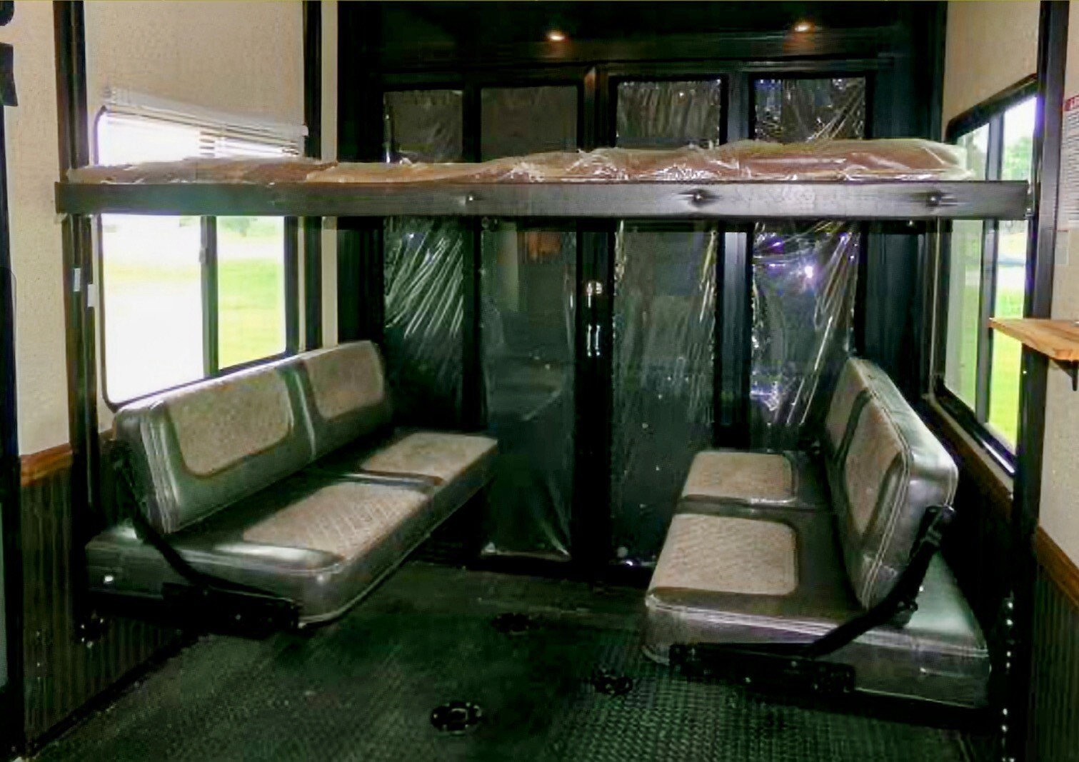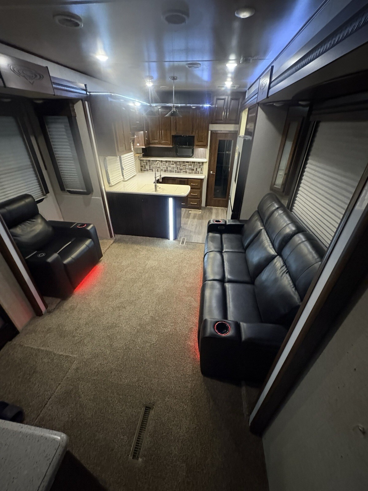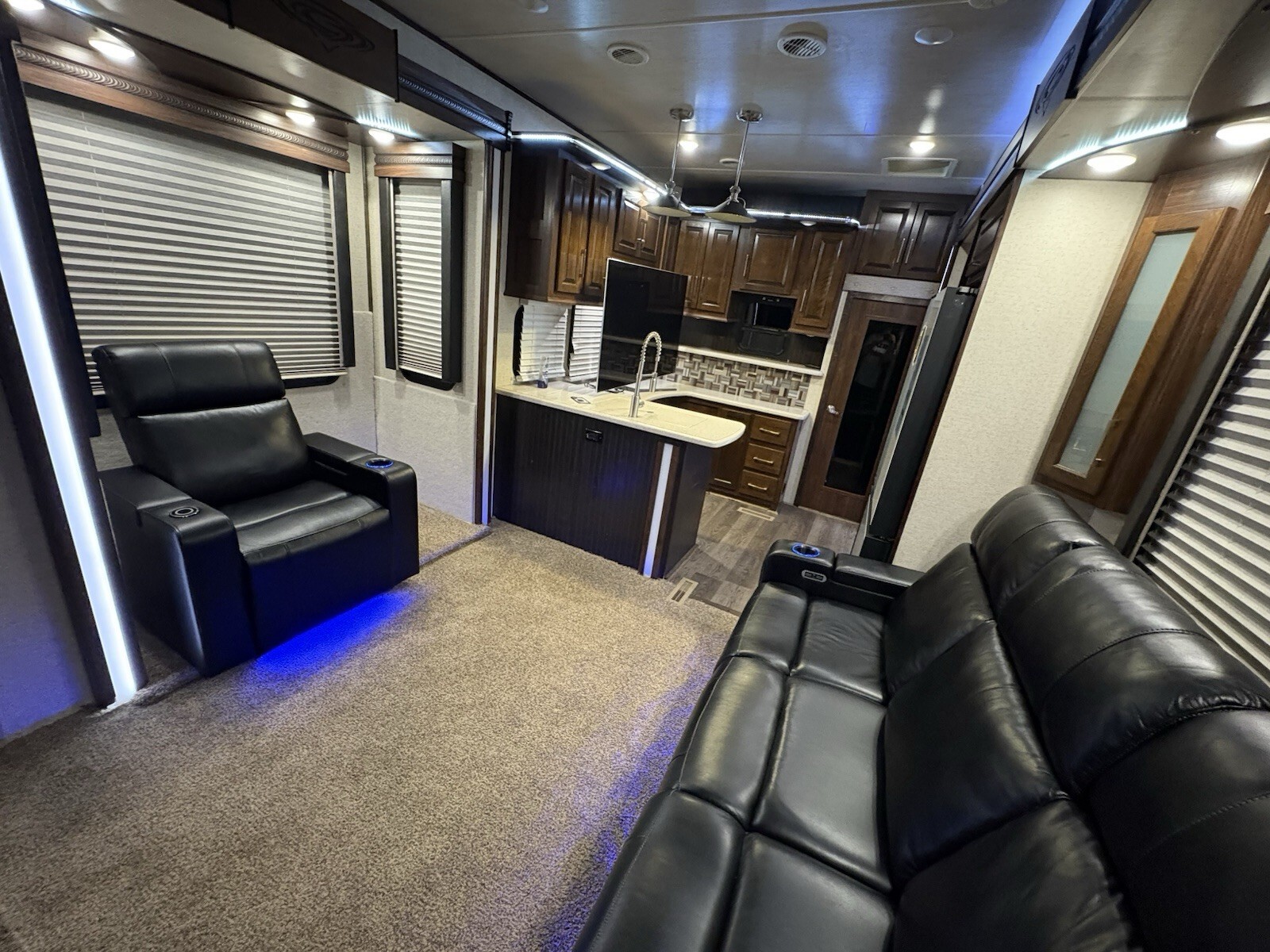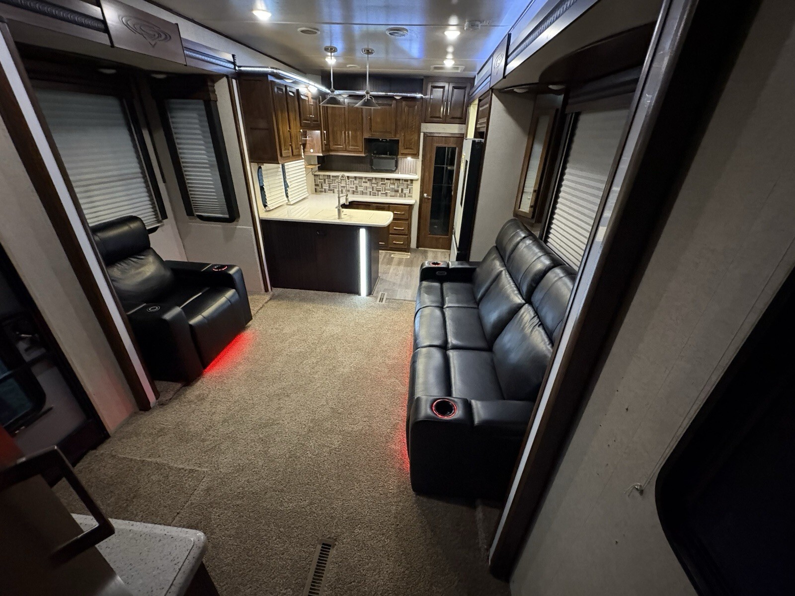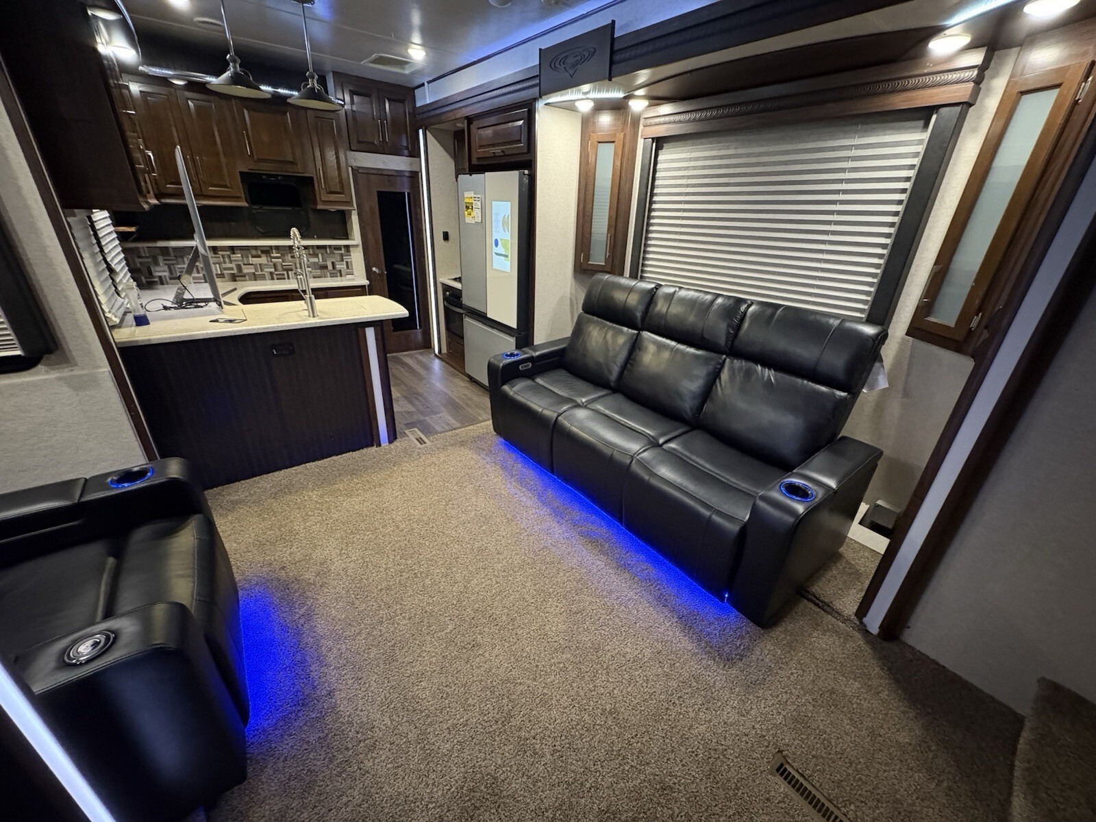 13' Garage w/ LoftBath & A Half3 AC Units3 Season DoorsRamp Door Patio W/ DECKspacious and well-appointed toy hauler fifth wheel that combines robust build quality with family-friendly comfort and garage versatility. At over 44 feet in length and featuring three expansive slide-outs, its layout offers generous room for both living and cargo space. The rear 13 foot garage doubles as an entertainment zone or gear-storage area, complete with fold out sofas that convert into additional beds, a side lounge, and storageWithin, the central living area unfolds into a horseshoe-shaped kitchen featuring solid-surface counters, a large dual-basin sink, three-burner cooktop, oven, microwave, and a brand new touch screen Samsung Bespoke Smart refrigerator installed.863-8ninenine5702