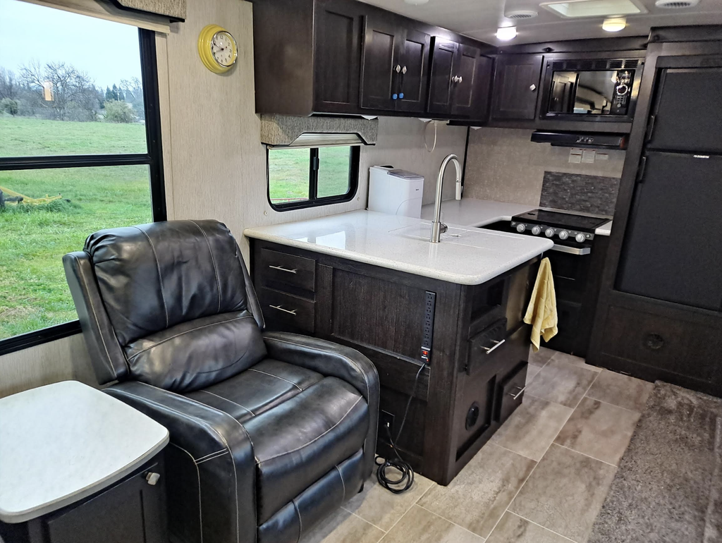 The popular rear-kitchen layout offers expansive counter space, abundant cabinetry, and a bright, open feel-perfect for extended stays or full-time living. Cooking and entertaining are effortless with the intelligently designed floorplan that keeps everything within reach while maintaining a spacious atmosphere.