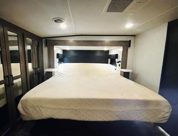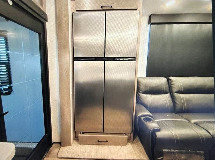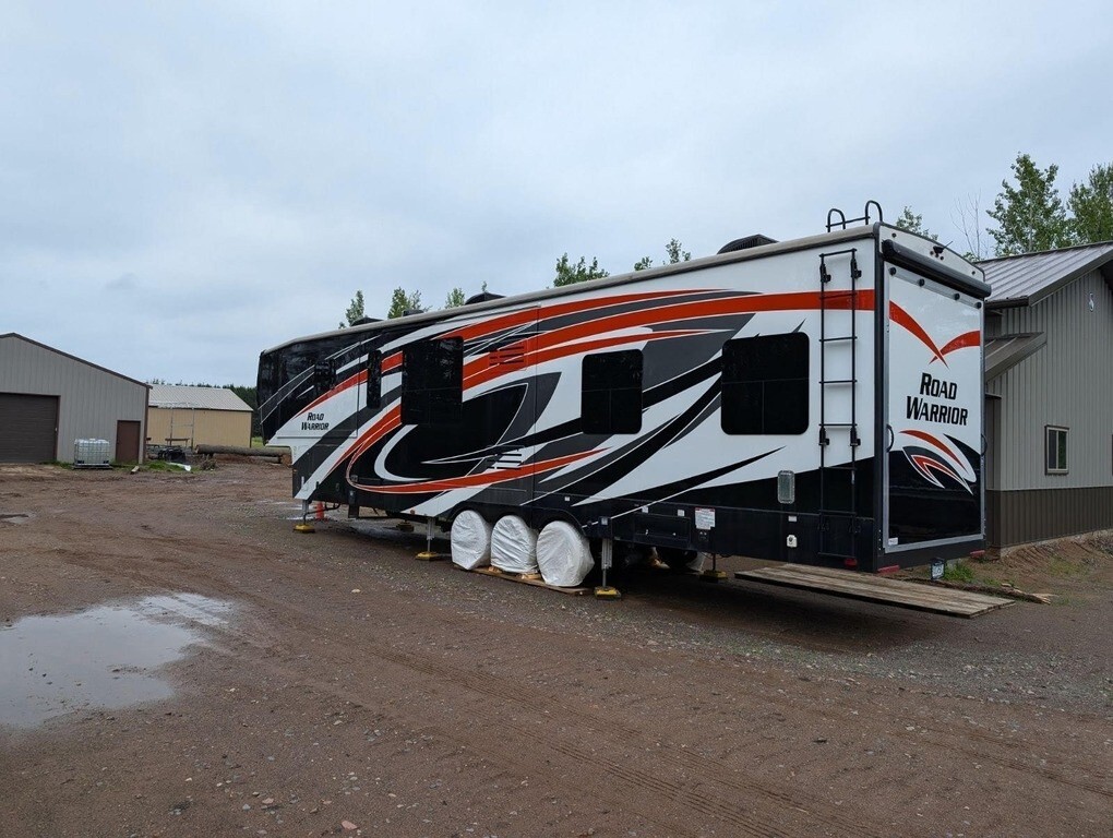For sale is a 2021 Heartland Road Warrior RW414, a top-tier fifth-wheel toy hauler designed for adventure and comfort. This meticulously maintained RV combines rugged durability with luxurious amenities, offering a spacious living area perfect for extended trips or full-time living. The RW414 features a large garage area with a ramp door, ideal for hauling toys or gear, along with a sleek, well-appointed interior. Enjoy the comforts of home with a modern kitchen including a full-sized refrigerator, a convection microwave, and a three-burner stovetop. The living space boasts plush seating, an entertainment center with a large TV, and ample storage. The master bedroom features a king-size bed, while the bathroom includes a walk-in shower. With multiple slide-outs, three air conditioning units, and a powerful generator, this Road Warrior ensures a comfortable and enjoyable experience wherever your journey takes you. Located and ready for viewing, this RV offers a fantastic blend of luxury and functionality for your next adventure. The Paint is Not Decals Custom Paint used on cars.