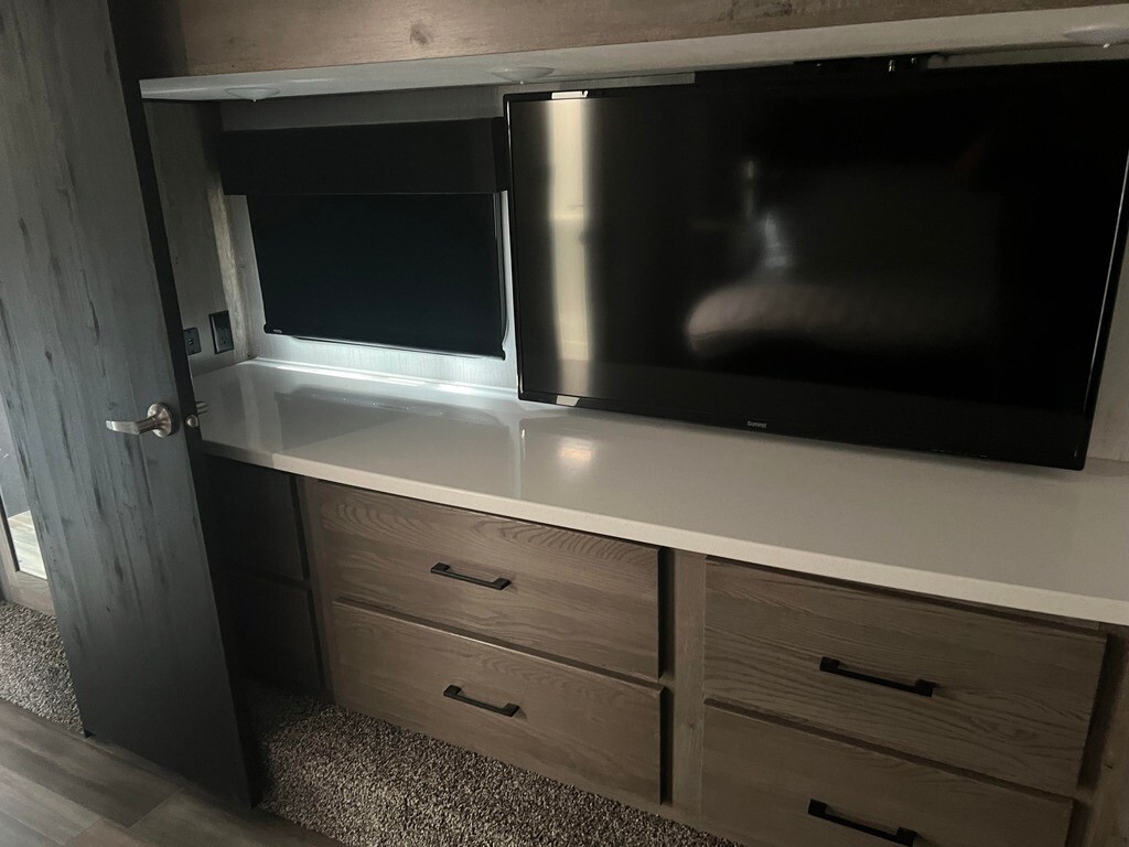 2021 Heartland Road Warrior RW 414 Fifth Wheel For sale is a 2021 Heartland Road Warrior RW414, a top-tier fifth-wheel toy hauler designed for adventure and comfort. This meticulously maintained RV combines rugged durability with luxurious amenities, offering a spacious living area perfect for extended trips or full-time living. The RW414 features a large garage area with a ramp door, ideal for hauling toys or gear, along with a sleek, well-appointed interior. Enjoy the comforts of home with a modern kitchen including a full-sized refrigerator, a convection microwave, and a three-burner stovetop. The living space boasts plush seating, an entertainment center with a large TV, and ample storage. The master bedroom features a king-siz