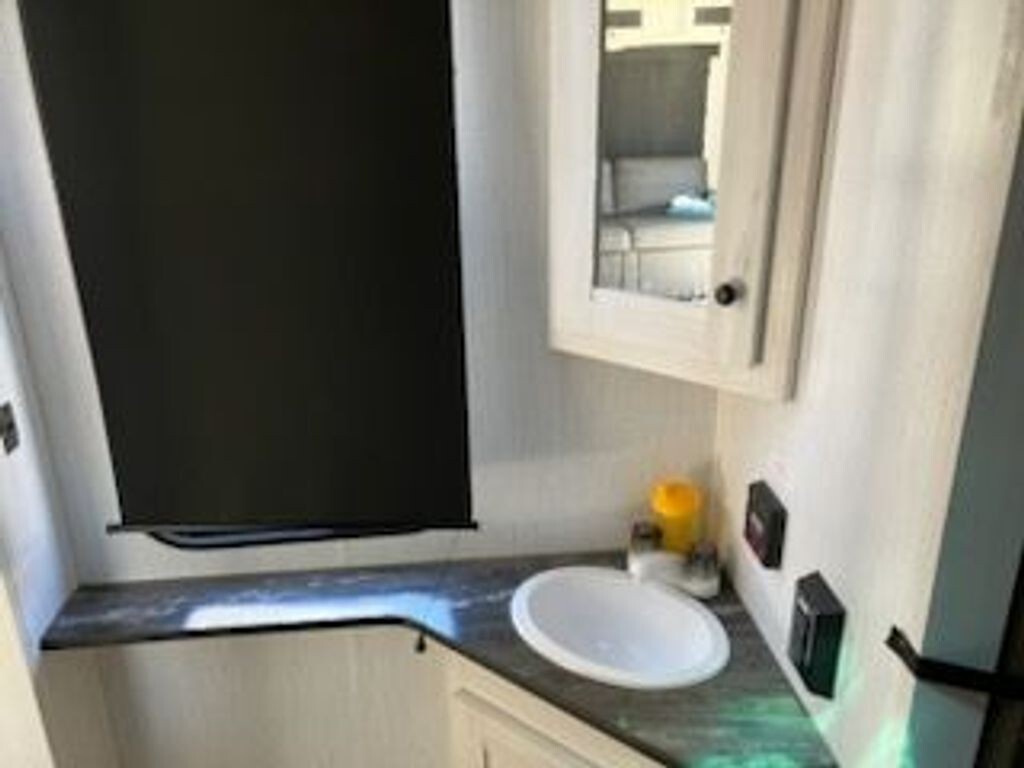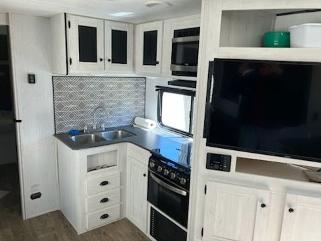 Kitchen: L-shaped kitchen with a 3-burner stove, oven, microwave, 10 cu. ft. 12V fridge, and undermount sink.