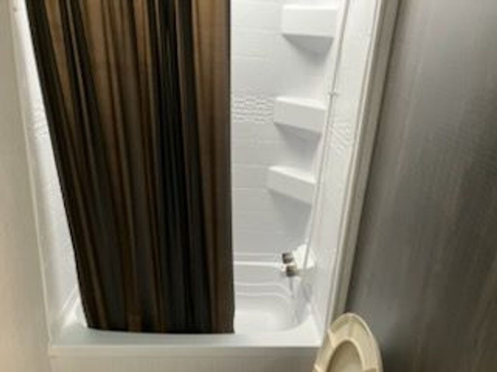 Bathroom: Full bath with a skylight, power vent, and tub/shower combo, with a second door for direct access from outside.