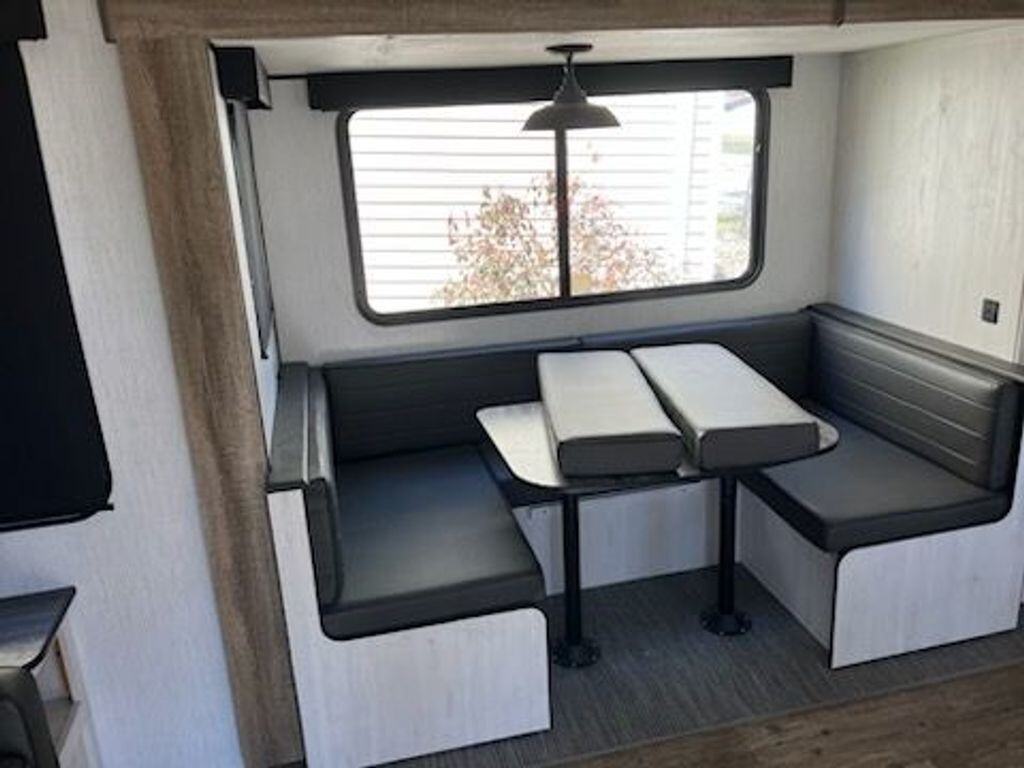 Layout: Rear living room with a sofa, U-shaped dinette in a deep slide, walk-through bathroom, and a front bedroom.