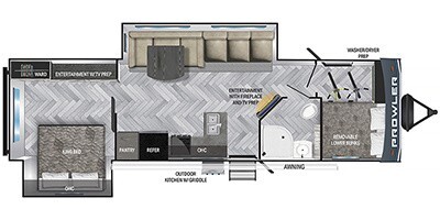 This Prowler has an overall length of 36.92 feet and comes equipped with 2 power retractable slide-outs, 1 power retractable awning, 1 A/C unit, a bunkroom, and plenty of room to sleep 10. This unit has been well-maintained.
