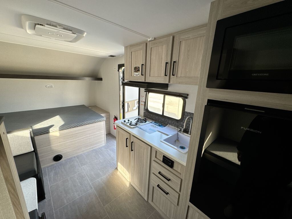 Inside, the 17BHLX features a thoughtfully designed floor plan that maximizes space and functionality. The main living area includes a cozy dinette that converts into an extra sleeping space, accommodating up to six people comfortably. The kitchen is equipped with a two-burner cooktop, microwave, and a 3.3 cu ft 12V refrigerator, providing all the essentials for meal preparation. Ample storage ensures you can bring along all your necessities for extended trips.