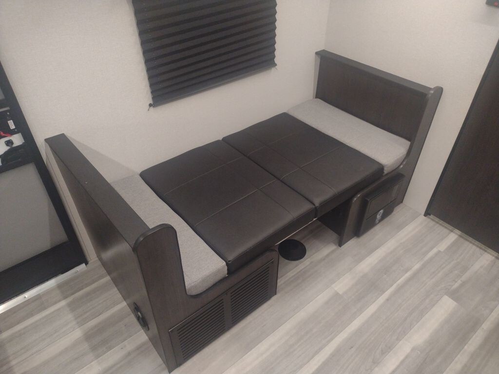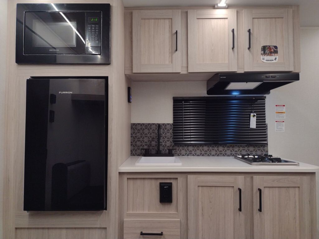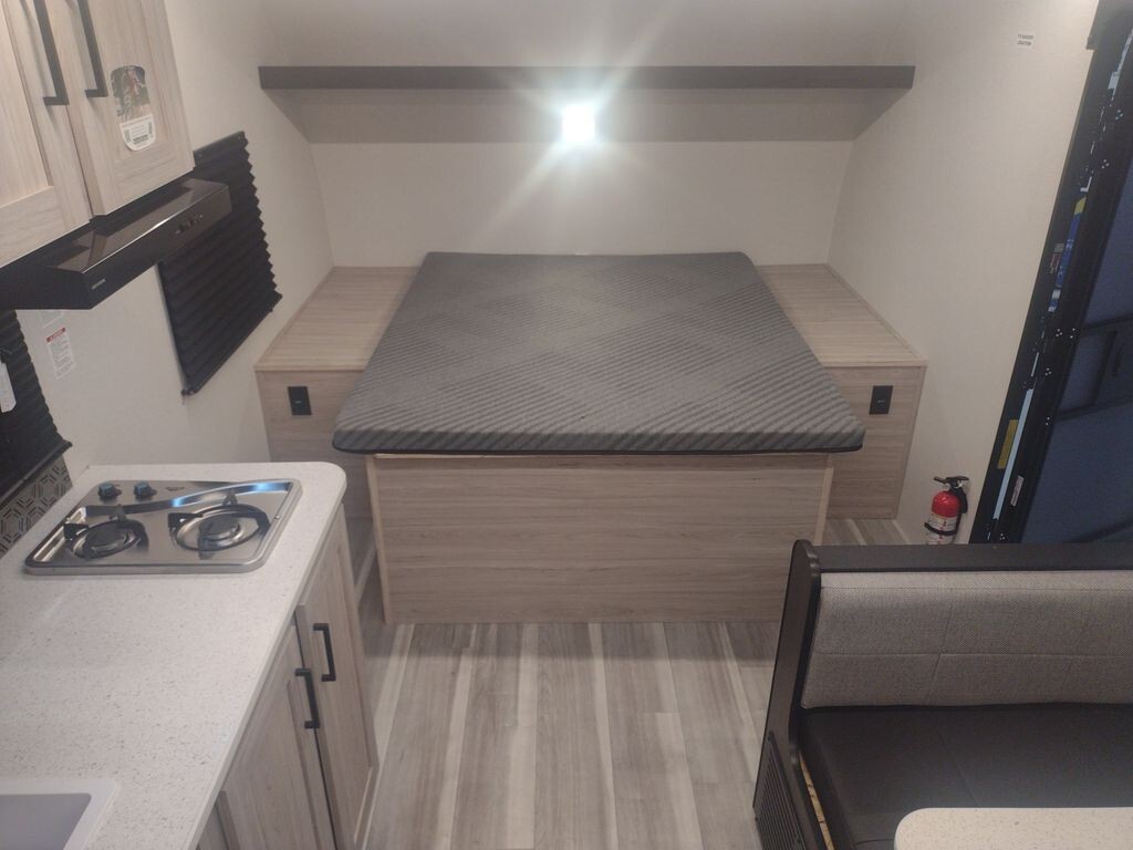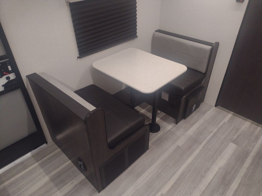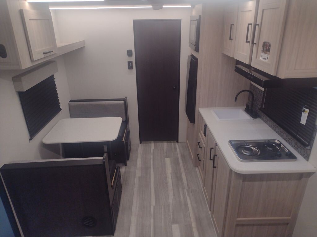 Inside, the 17RBLX offers a thoughtfully designed living space that maximizes comfort and functionality. The front features a cozy queen-sized bed, providing a restful retreat after a day of adventure. Adjacent to the sleeping area, a booth dinette serves as a
