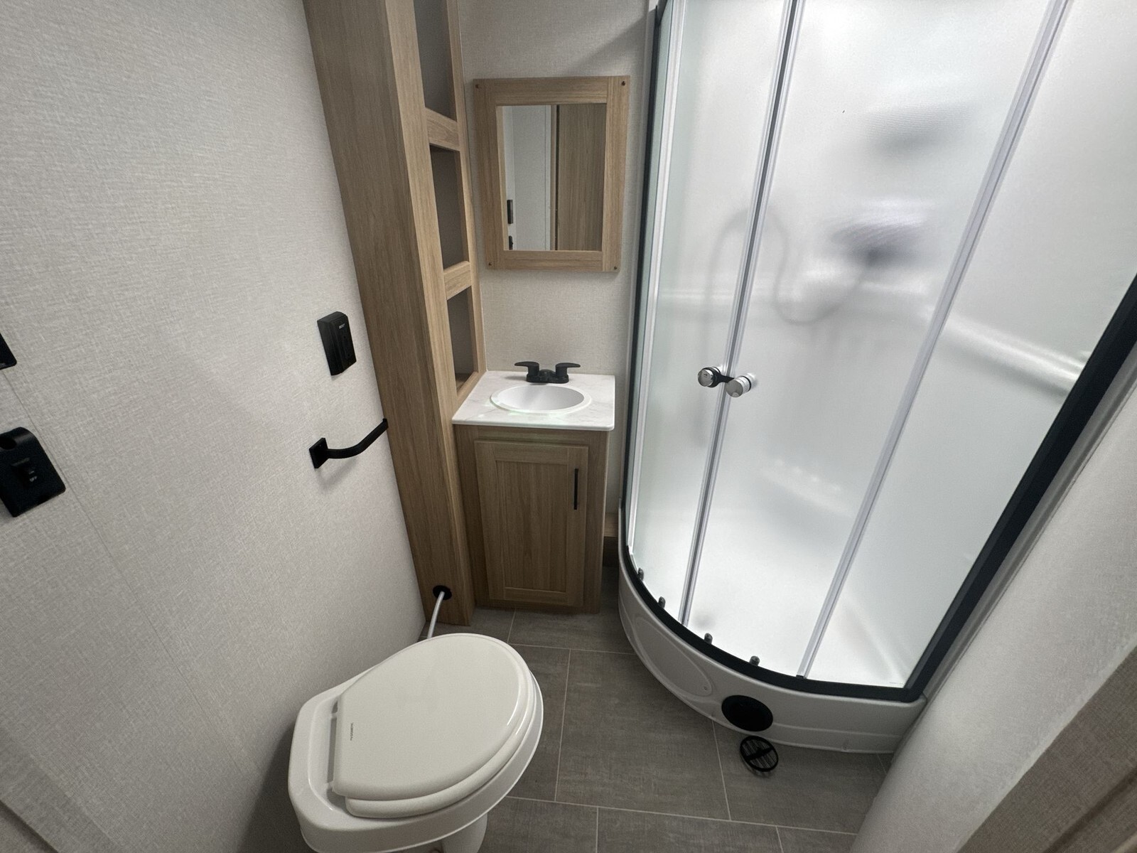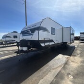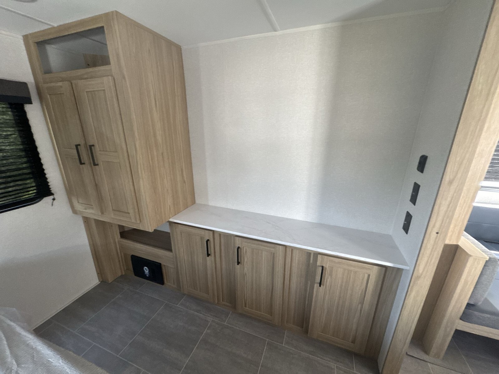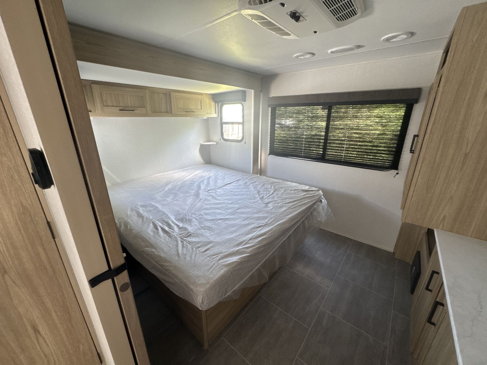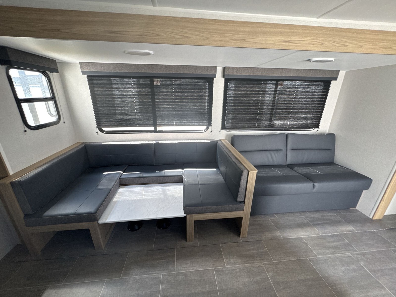 The exterior of the 3212BH features a sleek, aerodynamic profile that adds to its visual appeal and contributes to improved fuel efficiency. Constructed with durable aluminum and fiberglass sidewalls, this travel trailer is built for longevity and reliability. The 17-foot power awning with LED lighting extends your living space outdoors, providing shade and shelter for relaxation or entertainment.