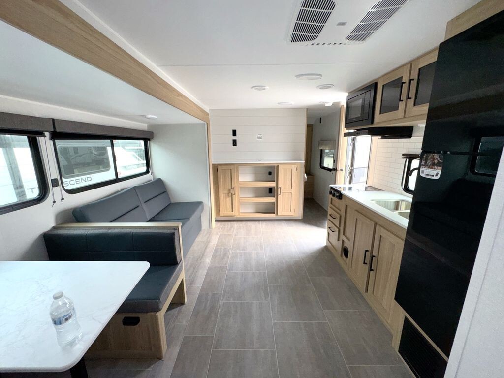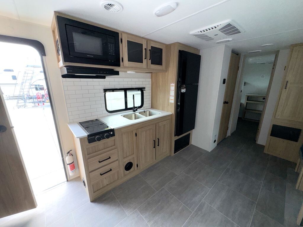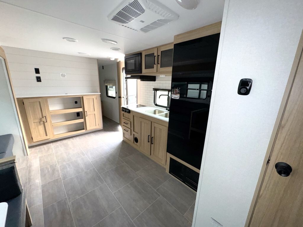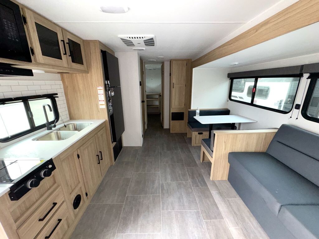 Inside, the 3005QBX features a well-planned floor plan that can sleep up to eight people. The front private bedroom includes a cozy queen-size bed, providing a restful space after a day of adventure. At the rear, a private bunkhouse with four bunks is perfect for children or guests, ensuring everyone has their own area.