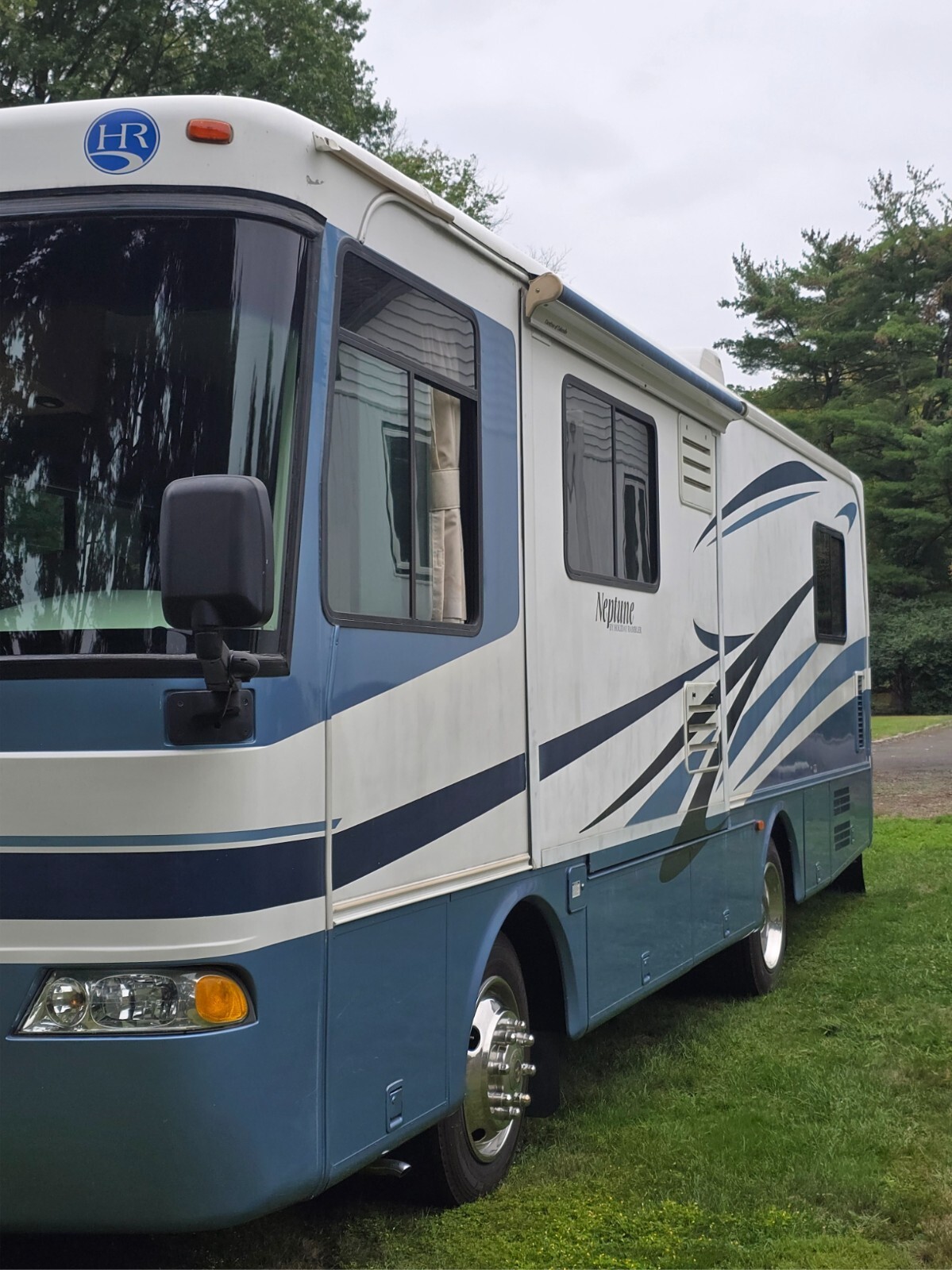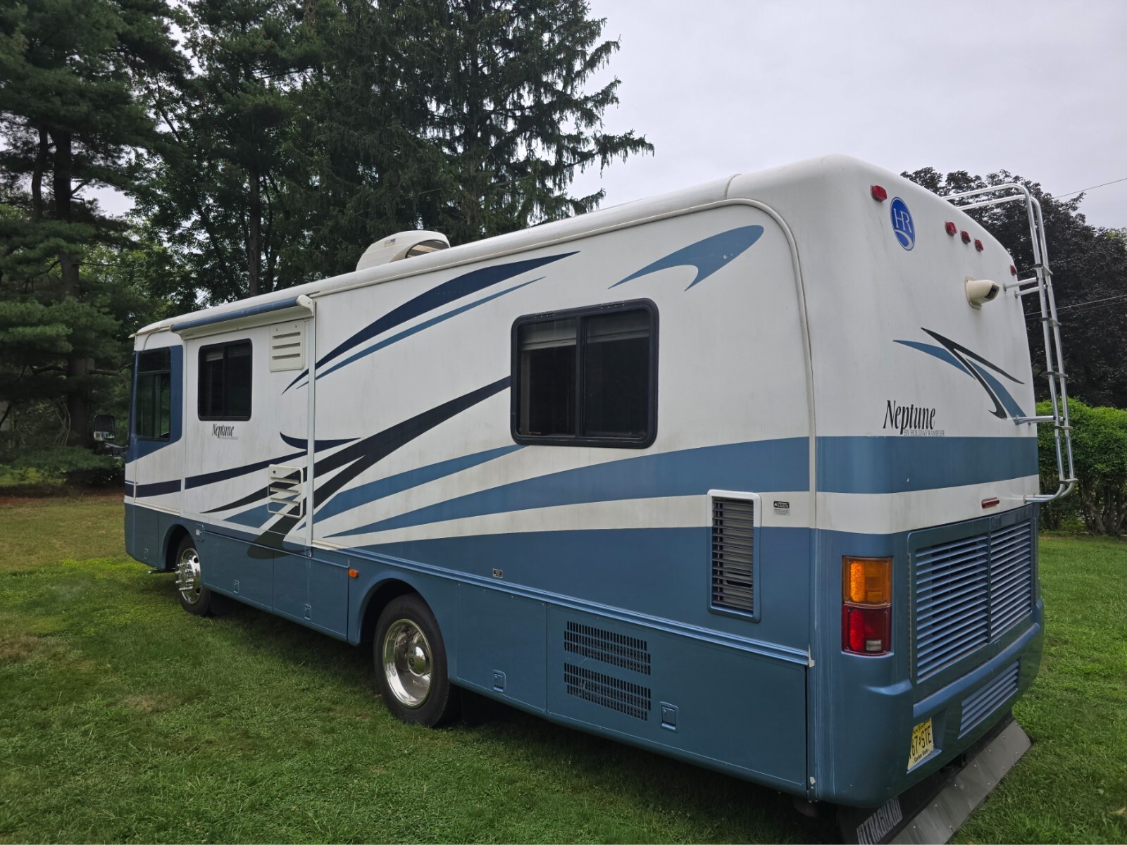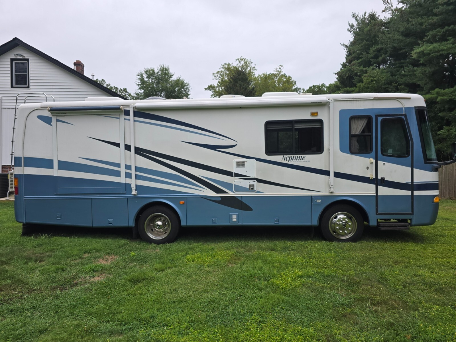 The 2003 Holiday Rumbler Neptun 30 is a Class A Motorhome with a sleeping capacity for 6 people. It has a water capacity of 71-80 gallons and is equipped with 2 air conditioners, 1 awning, and 2 slide outs. This RV is 30 feet long and has a diesel fuel type. It includes 7.5 Kw diesel generato, 600 amp lithium phosphate house battery bank. Two AGM starting batteries with DC to DC charger by Victron. Leveling jacks and was manufactured in the United States. The vehicle title is clean, making it a reliable choice for those looking for a spacious and well-equipped RV for their travels.