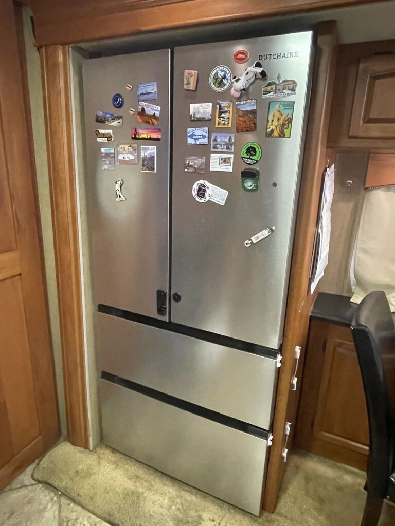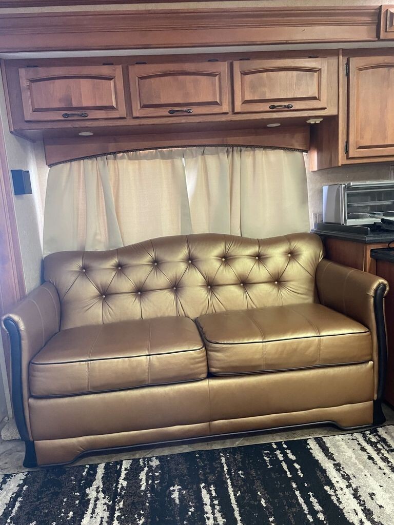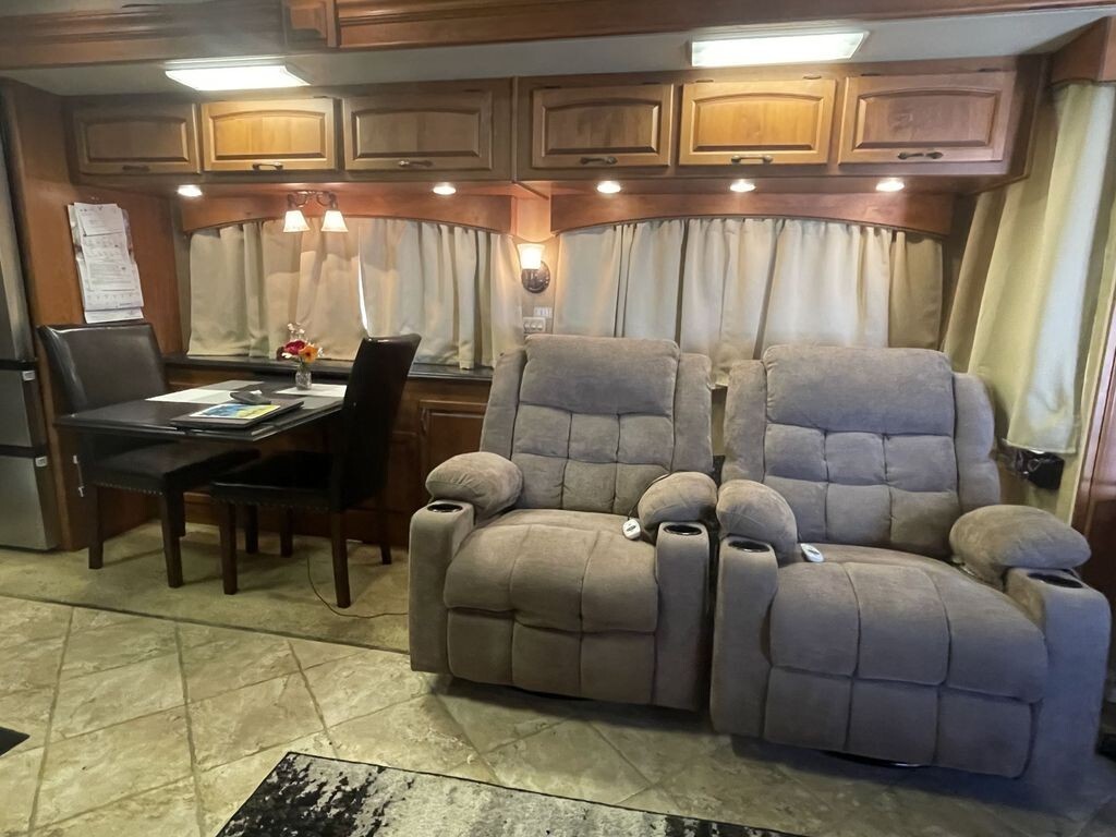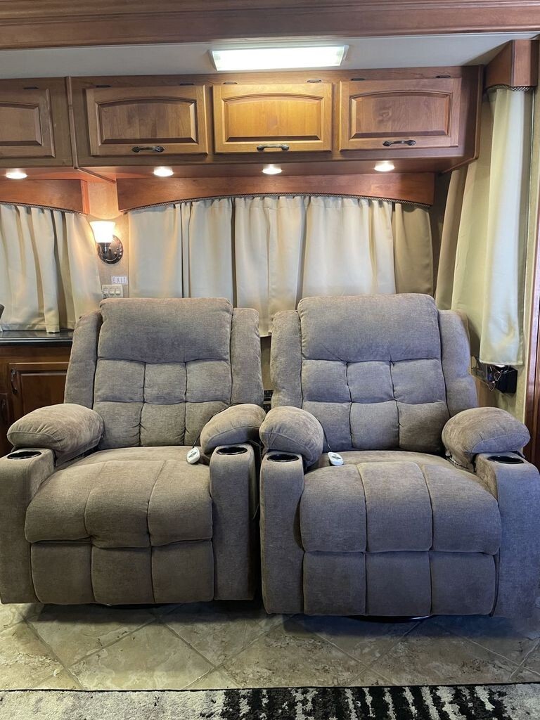 The living area has been tastefully updated with residential-style finishes, including a Smart TV, two recliner chairs (original sofa still available), and new blackout curtains throughout for comfort and privacy. The kitchen features a residential French-door refrigerator with dual freezer drawers and upgraded residential-style sink faucets.