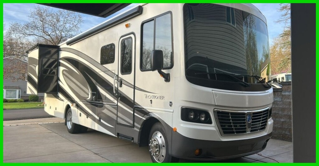 2017 Holiday Rambler Vacationer 33C Class A Motorhome This 2017 Holiday Rambler Vacationer 33C is a beautifully maintained Class A motorhome with a clean title and full body paint that showcases its quality and curb appeal. The open floor plan creates a spacious living area, complete with a dinette sleeper, dual recliners (recently reupholstered), and a cozy fireplace. Sleeping accommodations include a queen-size bed in the rear, and entertainment is top-notch with four TVs, including an exterior setup with DVD player and surround sound. The kitchen features a residential refrigerator with ice maker that runs off bottled water, while the coach is climate-controlled with dual A/C units. Additional conveniences include hookups for a washer an
