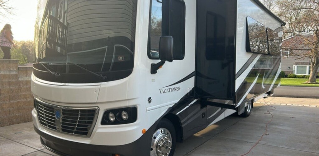 This 2017 Holiday Rambler Vacationer 33C is a beautifully maintained Class A motorhome with a clean title and full body paint that showcases its quality and curb appeal. The open floor plan creates a spacious living area, complete with a dinette sleeper, dual recliners (recently reupholstered), and a cozy fireplace. Sleeping accommodations include a queen-size bed in the rear, and entertainment is top-notch with four TVs, including an exterior setup with DVD player and surround sound. The kitchen features a residential refrigerator with ice maker that runs off bottled water, while the coach is climate-controlled with dual A/C units. Additional conveniences include hookups for a washer and dryer, an ONAN 5.5kw generator with just 524.4 hours, and furniture in excellent condition throughout. A well-equipped and comfortable motorhome, it’s ready for both short trips and extended adventures.