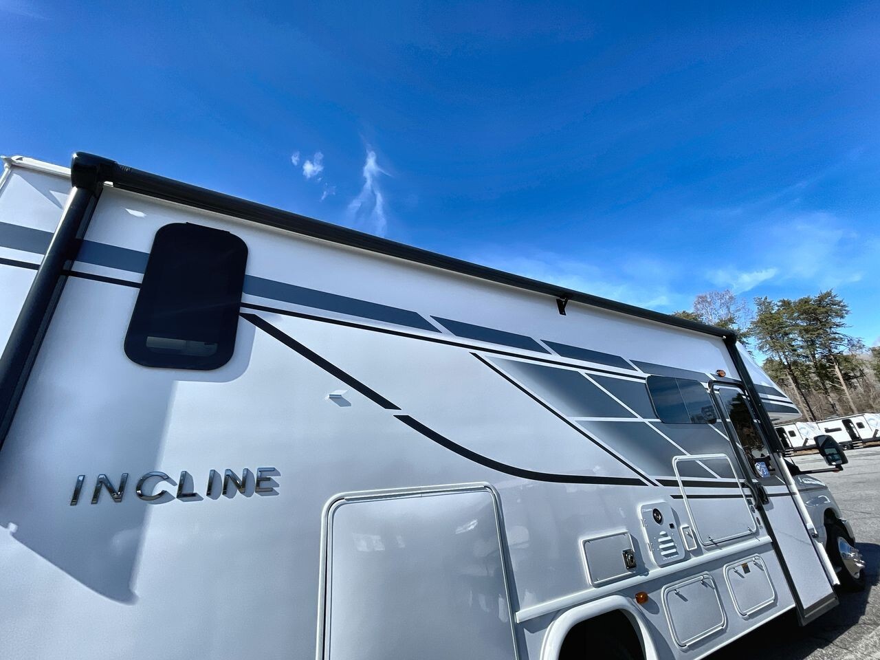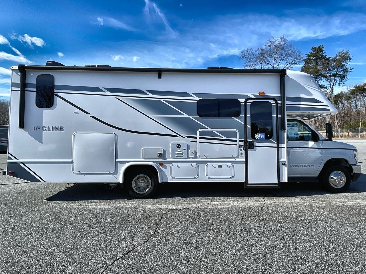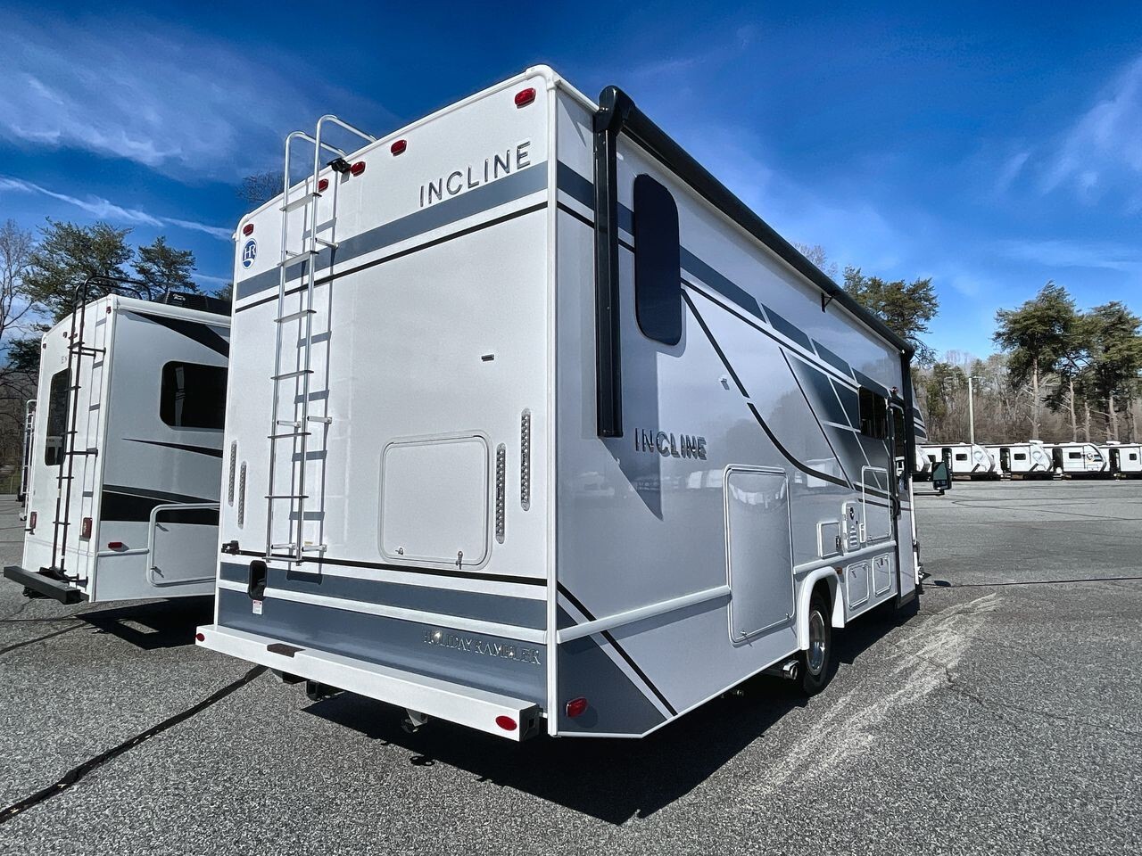 The 2025 Holiday Rambler Incline 27U is a modern Class C motorhome designed for comfort and convenience. Built on the reliable Ford E-450 chassis and powered by a 7.3L V8 engine with 325 horsepower and 450 lb-ft of torque, it offers a smooth ride for both short trips and long journeys.Measuring 29.5 feet in length, 8.5 feet in width, and 11.58 feet in height, the 27U provides a spacious interior with a 7-foot ceiling height, allowing ample room for movement. The well-planned layout includes a cozy lounge area with plush seating and a U-shaped dinette, ideal for socializing or enjoying meals. The entertainment system features two flat-screen TVs and premium speakers, offering various entertainment options on the go.The kitchen is equipped with modern appliances, including a full-size electric refrigerator, convection microwave oven, and a three-burner stove with an overhead fan, making meal preparation straightforward. Ample