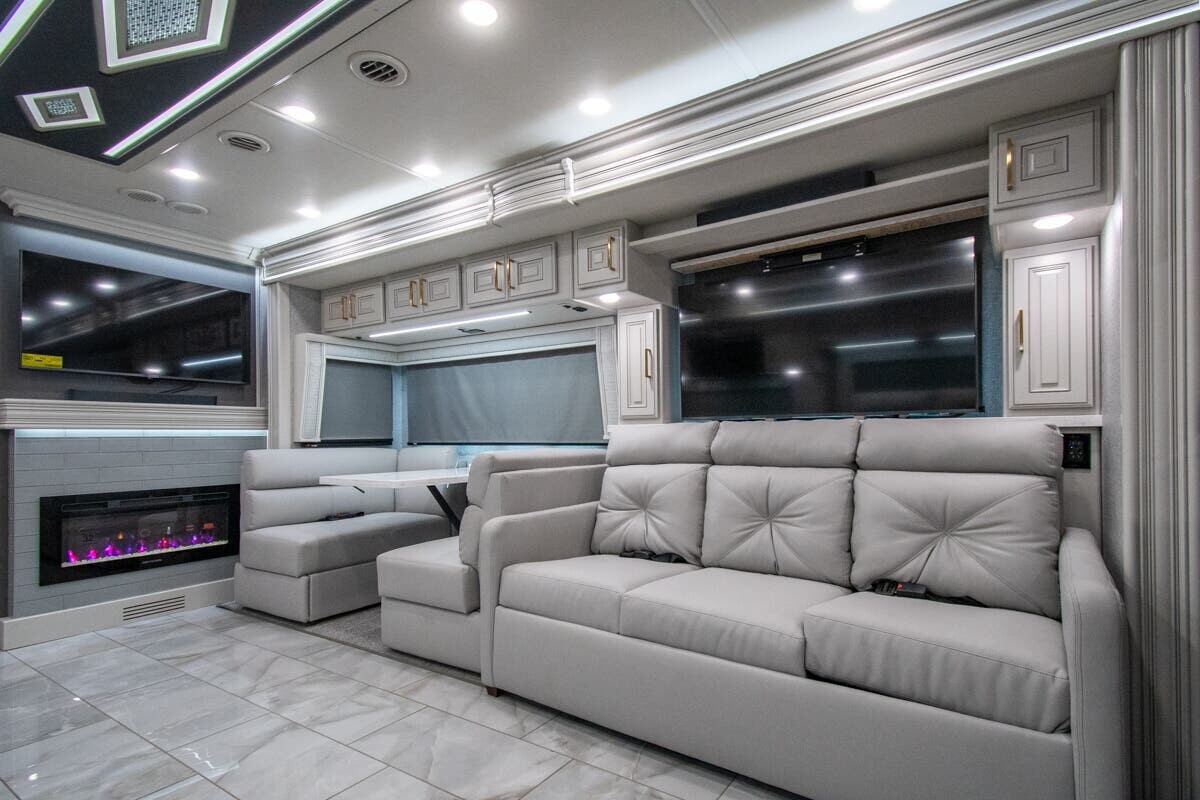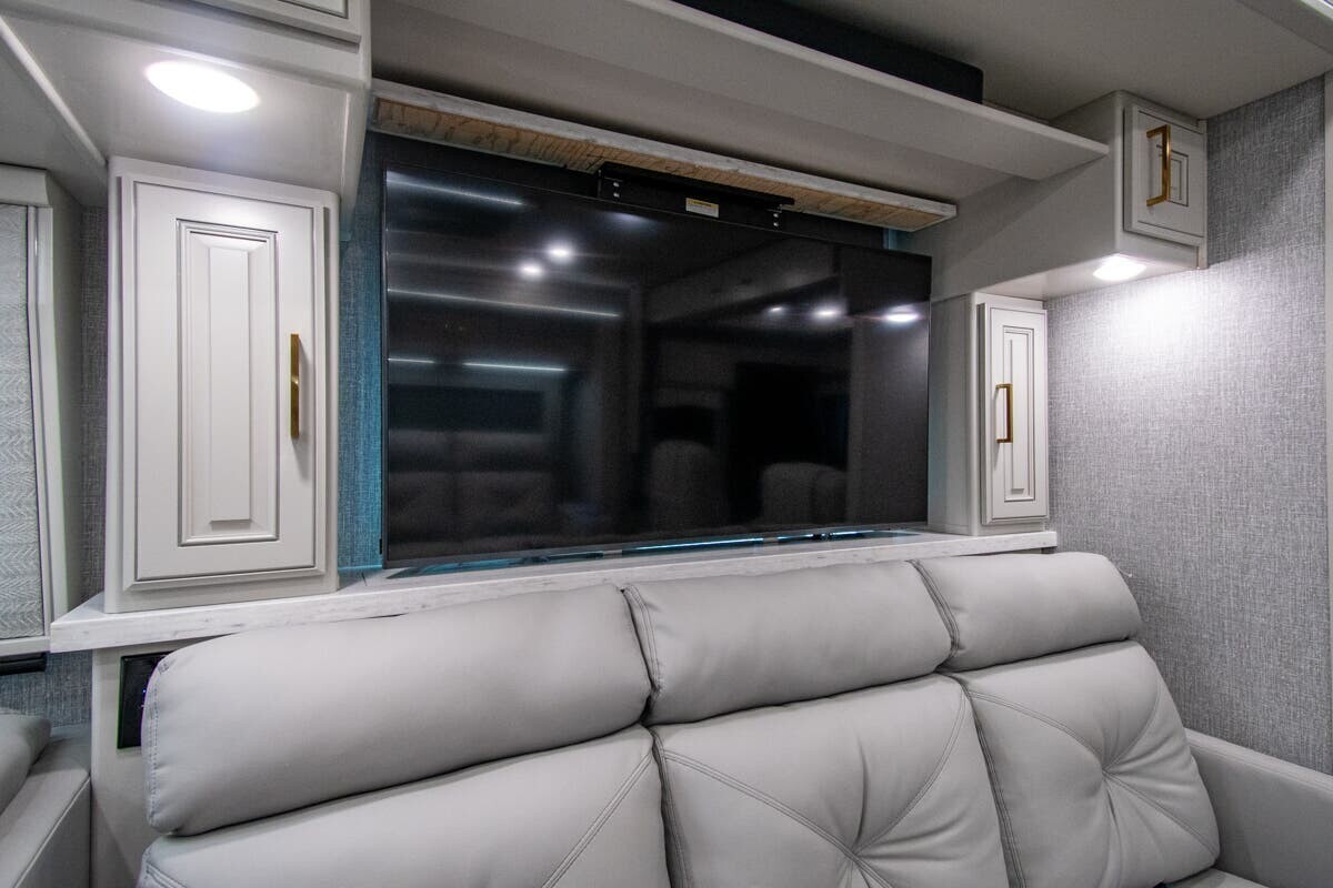 The living area offers comfortable seating, a large flat-screen TV, and a premium sound system, creating an inviting