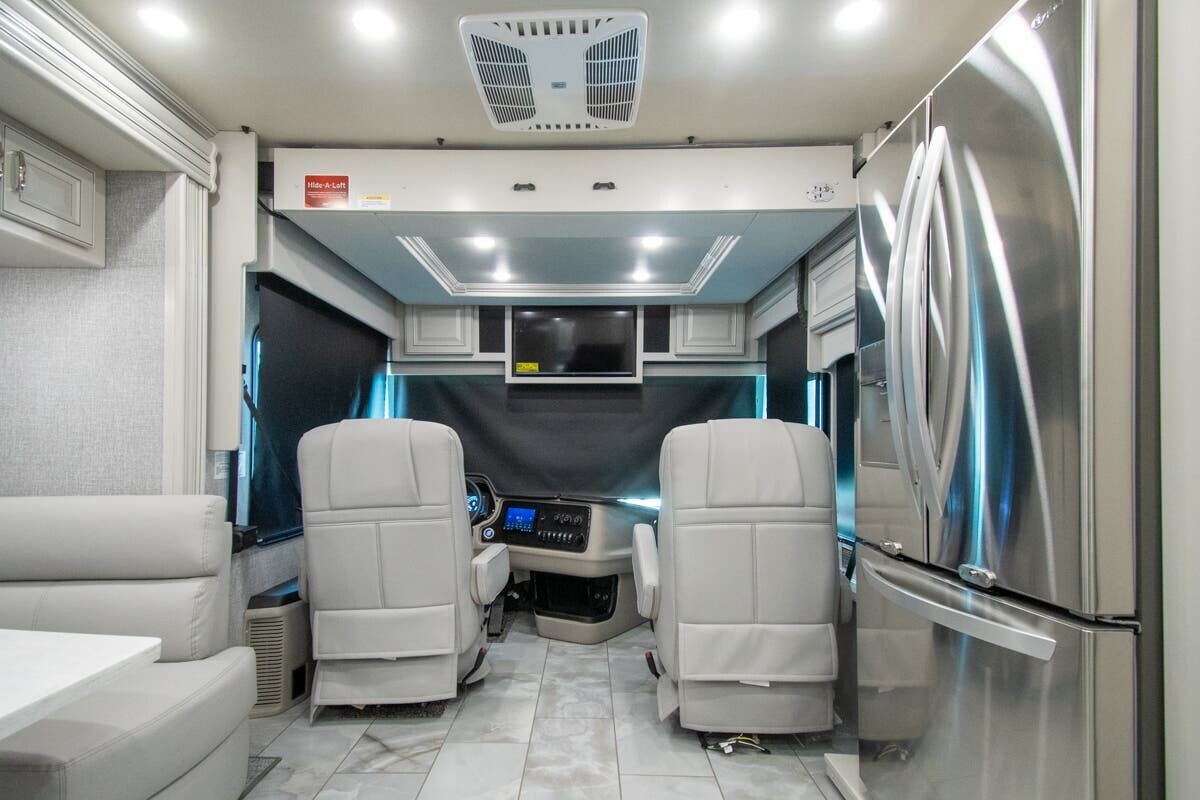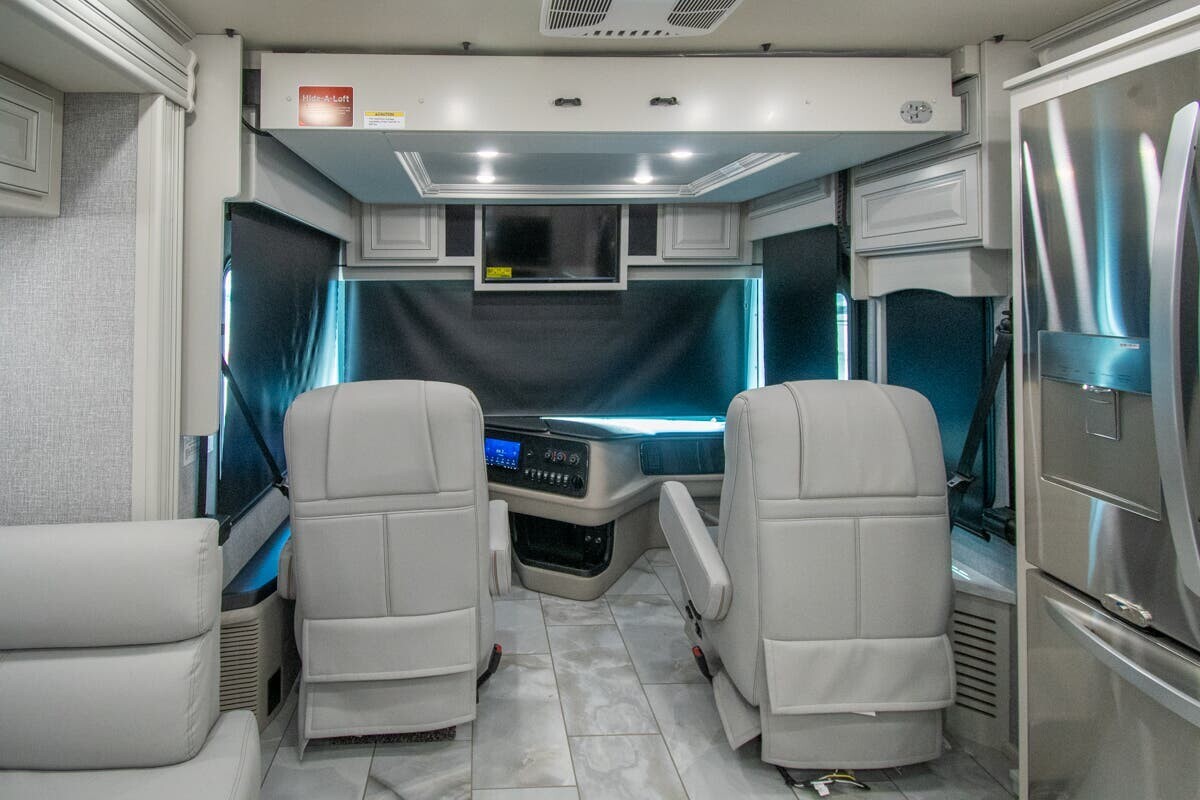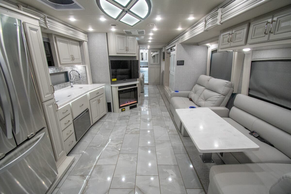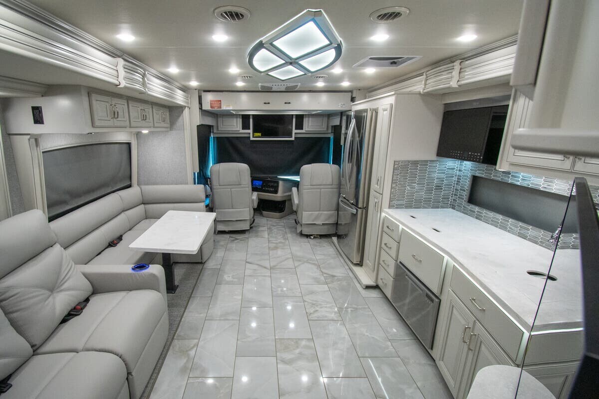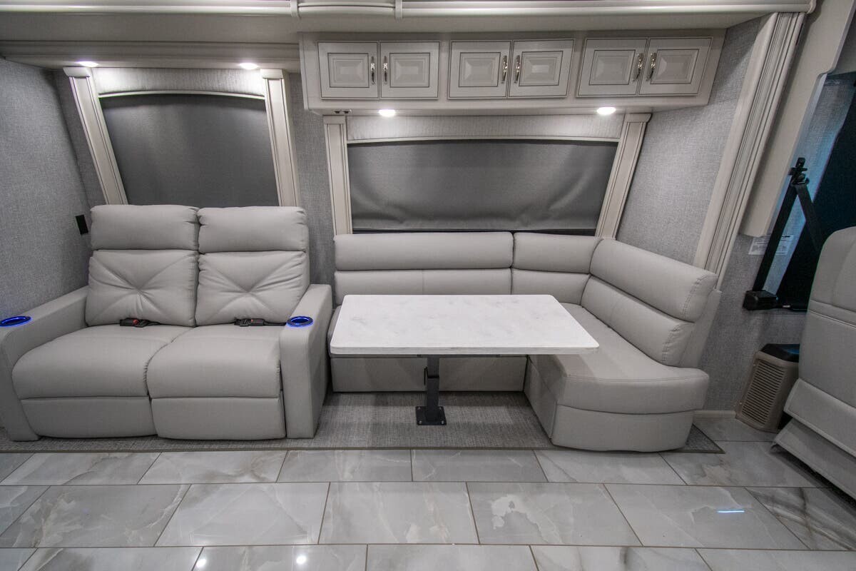 Measuring 38 feet 8 inches in length, this motorhome features three slide-outs that expand the living space. The exterior includes full-body paint and an 18-foot electric awning with LED lighting and motion sensor retract, creating a pleasant outdoor area. With 127 cubic feet of basement storage, you can bring along all your travel essentials.