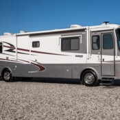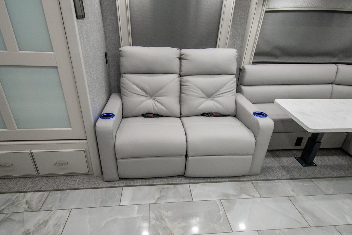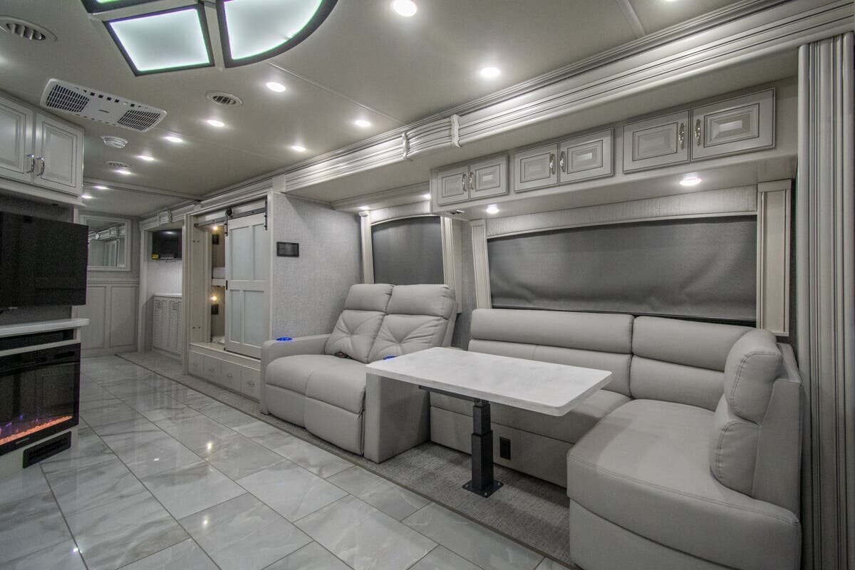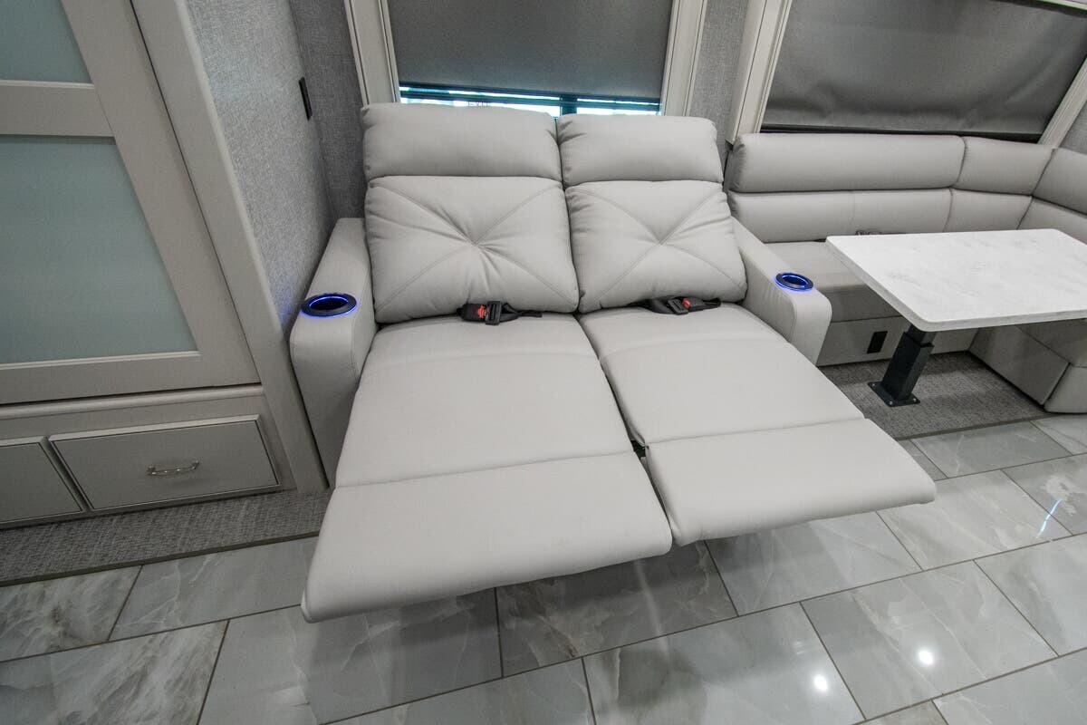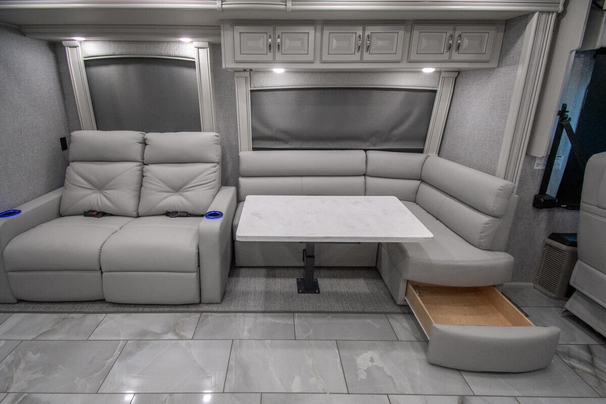 Measuring 38 feet 8 inches in length, this motorhome features three slide-outs that expand the living space. The exterior includes full-body paint and an 18-foot electric awning with LED lighting and motion sensor retract, creating a pleasant outdoor area. With 127 cubic feet of basement storage, you can bring along all your travel essentials.