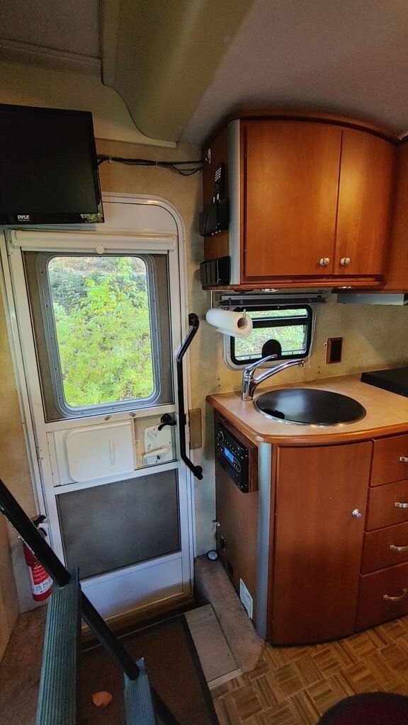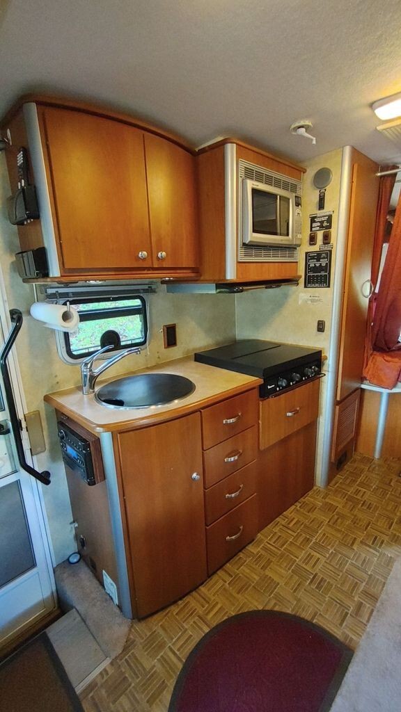Step inside to a thoughtfully laid-out interior where every inch has been optimized for comfort and convenience. The open living area features cozy seating and large panoramic windows that fill the space with natural light and beautiful views. The well-equipped kitchen includes a refrigerator/freezer, cooktop, microwave, and ample storage, making meal prep easy whether youre on the road or at the campsite.