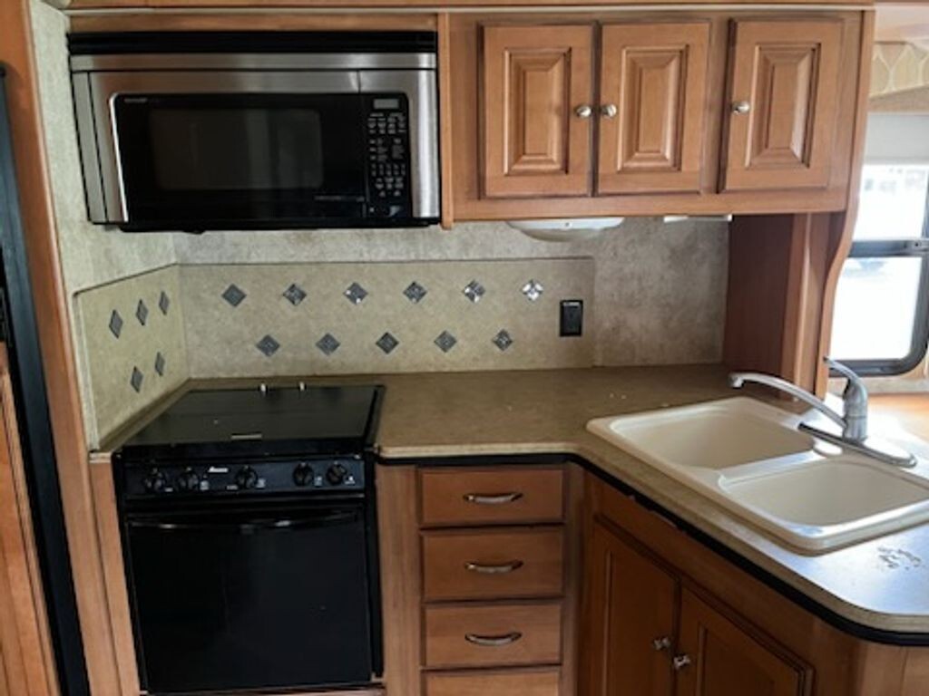 Fully Equipped Kitchen: Modern appliances, solid-surface countertops, and generous storage make cooking on the road a pleasure.