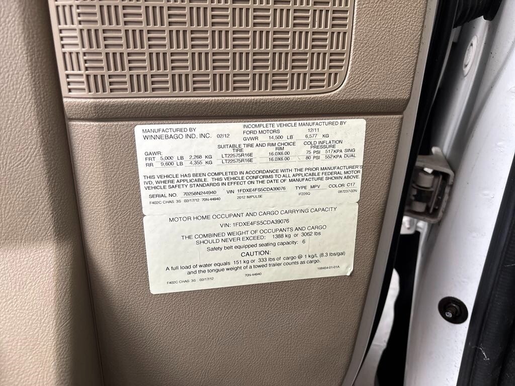 Year: 2012 Make: Winnebago Itasca Model: Impulse Length: approx. 27–29 ft Chassis: 2012 Ford E-450 Super Duty (GVWR 14,500 lbs.) Engine: 6.8L V10 SMPI Gasoline Fuel: Gasoline Mileage: 54,000 miles Generator: Yes ( nonoperational)Running / Mechanical