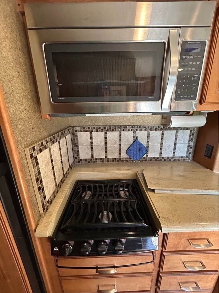 Inside, youll find a spacious, well-designed interior featuring multiple slide-outs that open up the living area, creating a bright and welcoming space. The fully equipped kitchen includes solid-surface countertops, a residential-style refrigerator, microwave, and plenty of cabinet storageperfect for cooking on the road. The comfortable living room features plush seating and an entertainment center, making it easy to relax after a day of exploring.