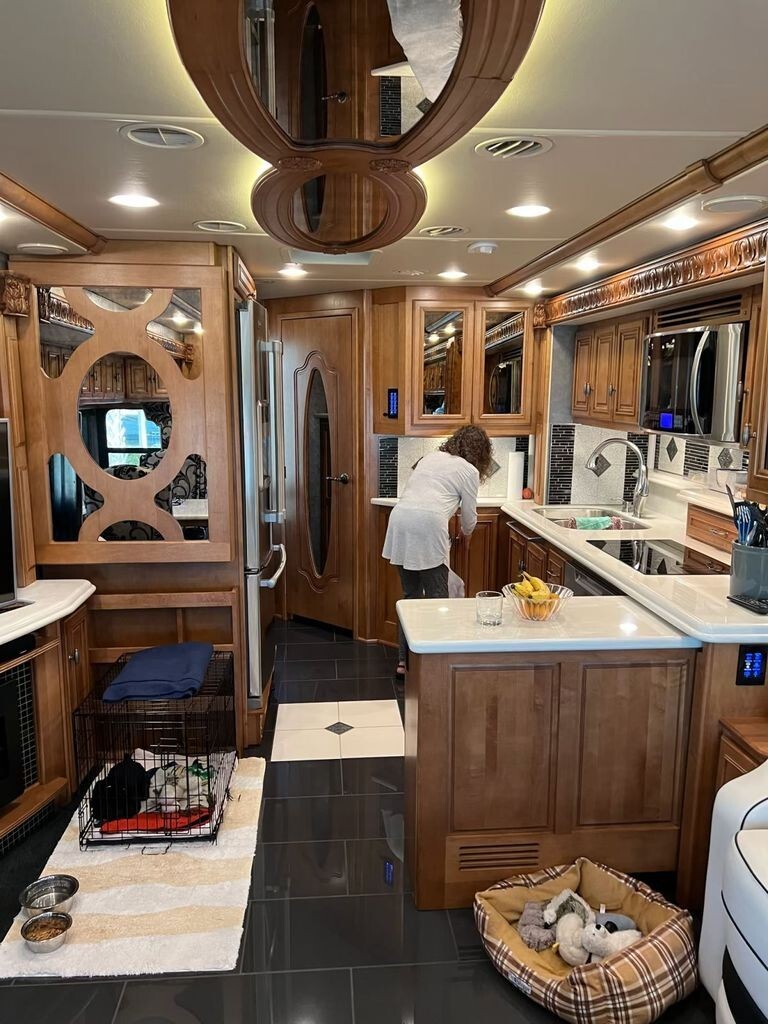 The gourmet kitchen is fully residential with a large residential refrigerator, a convenient drawer-style dishwasher, polished solid-surface countertops, and a modern 3-burner induction cooktop. Whether youre cooking on the road or parked at a resort, this space is designed for comfort and efficiency.