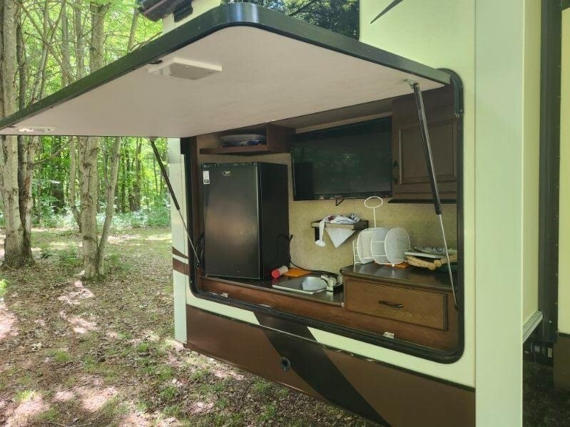 2015 Jayco Eagle Premier 375BHFS Fifth Wheel For Sale in Plattsburgh, NY 12901 This Jayco has an overall length of 43.4 feet and comes equipped with 5 power-retractable slide-outs with remote, a 17-foot power awning, 1 A/C unit with heat pump, a bunkhouse, 1½ baths, an outdoor kitchen & entertainment system, 5 LCD TVs throughout, and room to sleep up to 10. This unit has been well-maintained. Kitchen/Living Area Features 3-Burner Stove/Oven Overhead Fan Microwave Mid-Size Fridge/Freezer Sink & Faucet on Island Pantry/Storage Space