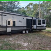 Along the rear wall of this Jayco model there are two lounge chairs and an end table. You will also find an overhead cabinet that runs the width of the trailer which is located above the chairs. The slide has a sofa with an overhead cabinet and a dinette or you can choose an optional table and chairs and an optional hide-a-bed sofa. Next to the slide there is a handy wardrobe. On the opposite side of the trailer you will find an entertainment center with optional fireplace, double kitchen sink, three burner range, microwave, refrigerator, and corner linen cabinet.