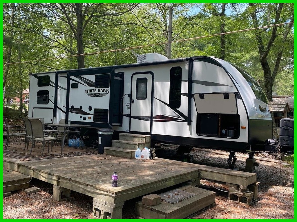 This Whitehawk has an overall length of 32.9 feet and comes equipped with 2 power retractable slide-outs, 1 power retractable awning, 2 full size bunk beds, and plenty of room to sleep 8. This unit has been well-maintained.
