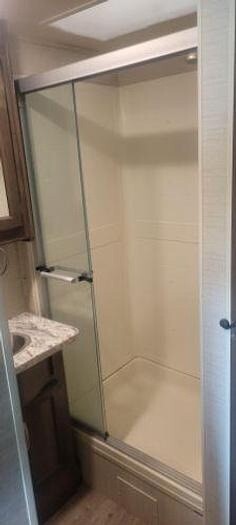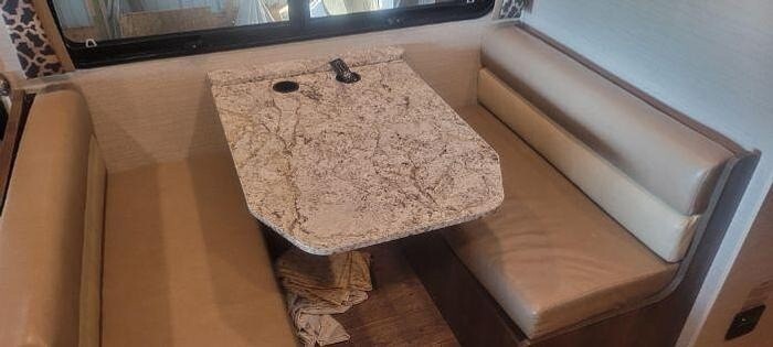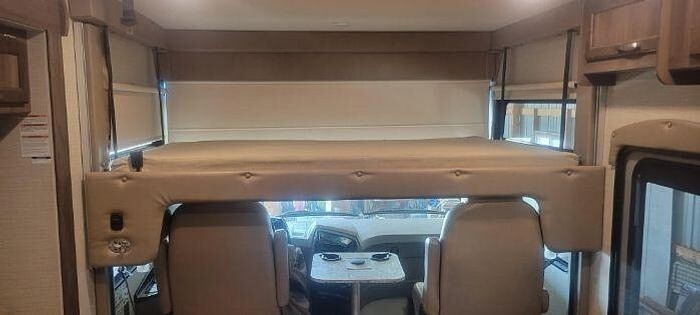 Storage is ample, thanks to full pass-through storage underneath, accommodating all your travel essentials without cluttering the living space. For sleeping arrangements, there's a comfortable bed over the cab and an electric shade for the front window, ensuring privacy and comfort.