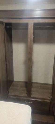 Practicality extends to its kitchen amenities, with a double-wide gas/electric fridge, an outside kitchen that includes a sink and fridge, and a full-length awning with lights, providing a perfect setup for outdoor dining and relaxation. The RV's self-sufficiency is guaranteed with a 4000 Onan RVQG generator and two new batteries, ensuring power is always available when off-grid.