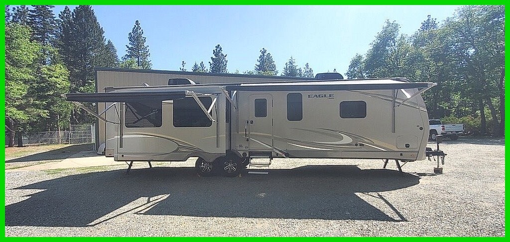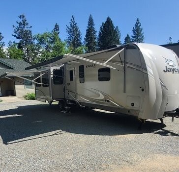 2019 Jayco Eagle 330RSTS Travel Trailer for Sale in Shingletown, CA 96088 This Jayco has an overall length of 39.3 feet and comes equipped with 3 slide-outs, 2 power awnings, solar prep, 2 ac units, and plenty of room to sleep 6. This unit has been well-maintained. Kitchen Features 3-Burner Stove/Oven Overhead Fan Microwave 8cu ft. 4-Door Wood Paneled Fridge/Freezer Kitchen Island with Residential Faucet and Split Stainless Steel Sink Pantry Storage Space Table with 2 Chairs Hutch