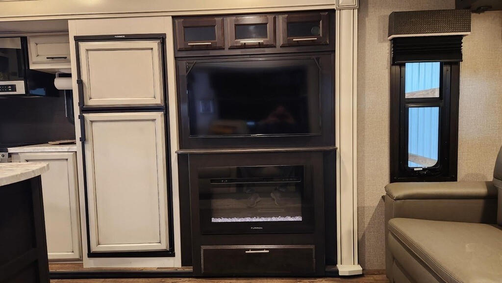This Jayco has an overall length of 32.58 feet and comes equipped with 3 power-retractable slide-outs, a 14-foot power awning, 2 A/C units, a fireplace, an outdoor kitchen, and plenty of room to sleep 4. The bedroom slide has a topper, and both other slides are prepped for toppers. This unit has been well-maintained.