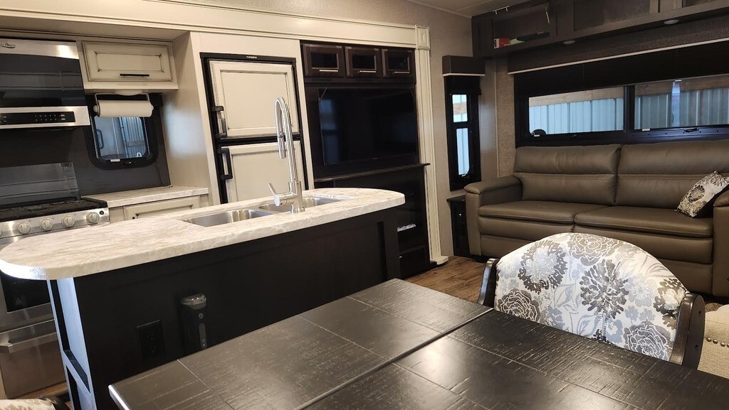 2020 Jayco Eagle HT 28.5RSTS Fifth Wheel For Sale in Blairsville, GA 30512 This Jayco has an overall length of 32.58 feet and comes equipped with 3 power-retractable slide-outs, a 14-foot power awning, 2 A/C units, a fireplace, an outdoor kitchen, and plenty of room to sleep 4. The bedroom slide has a topper, and both other slides are prepped for toppers. This unit has been well-maintained. Kitchen/Living Area Features 3-Burner Stove/Oven Overhead Fan Microwave Mid-Size Fridge/Freezer Sink & Faucet on Island Pantry/Storage Space Table &