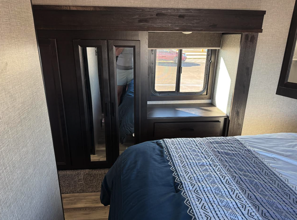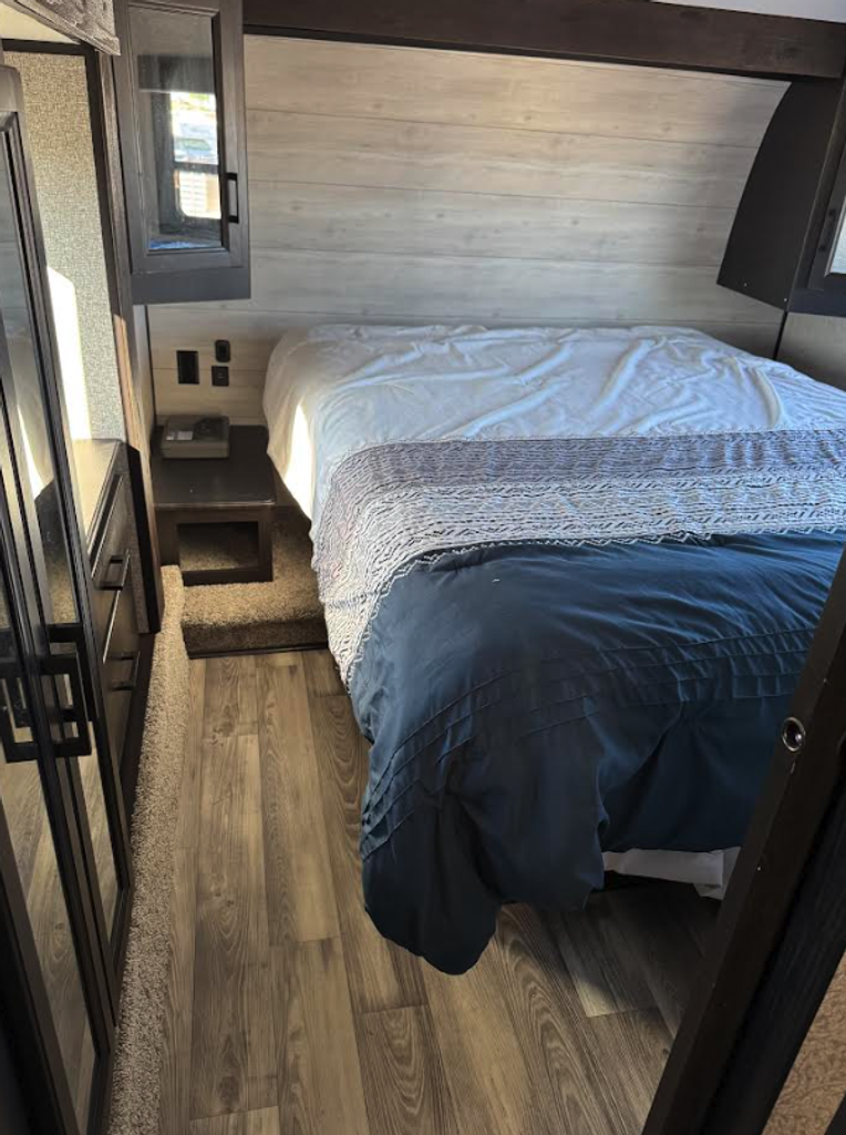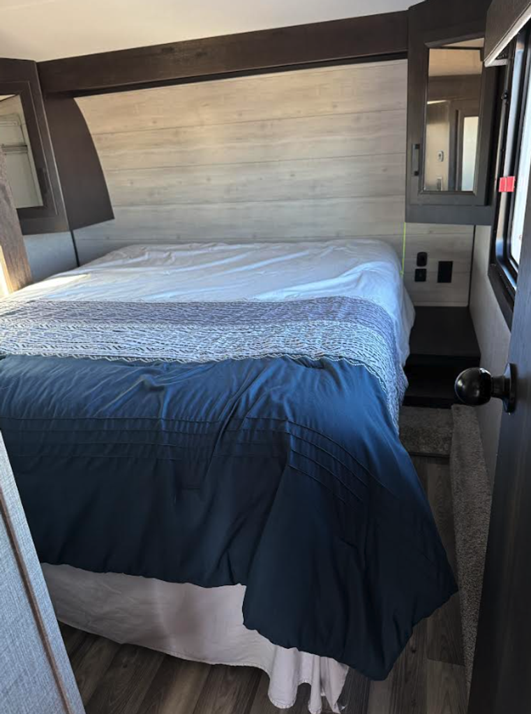 The private bedroom features a queen bed with a very comfortable memory foam mattress, offering true residential sleep quality on the road.