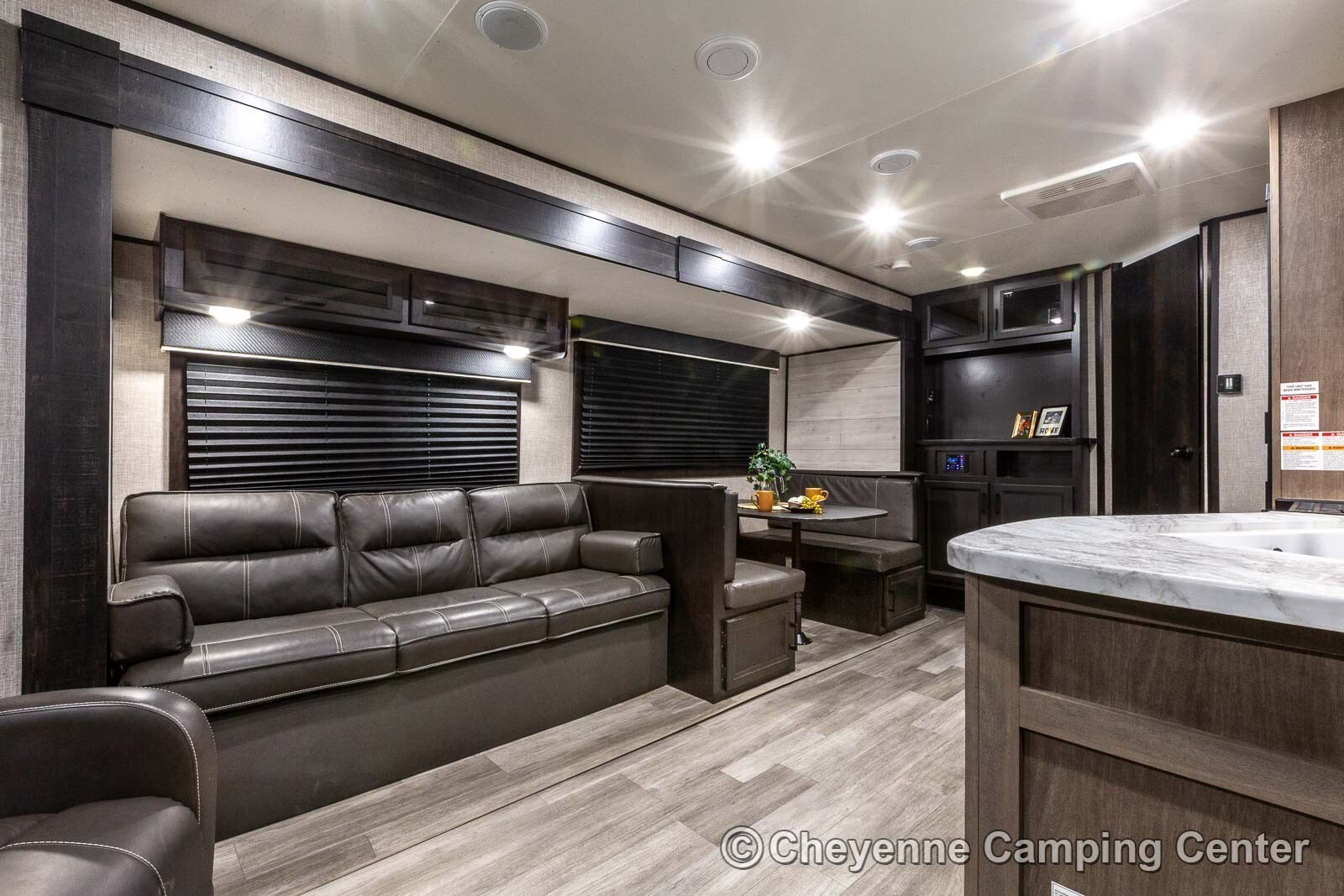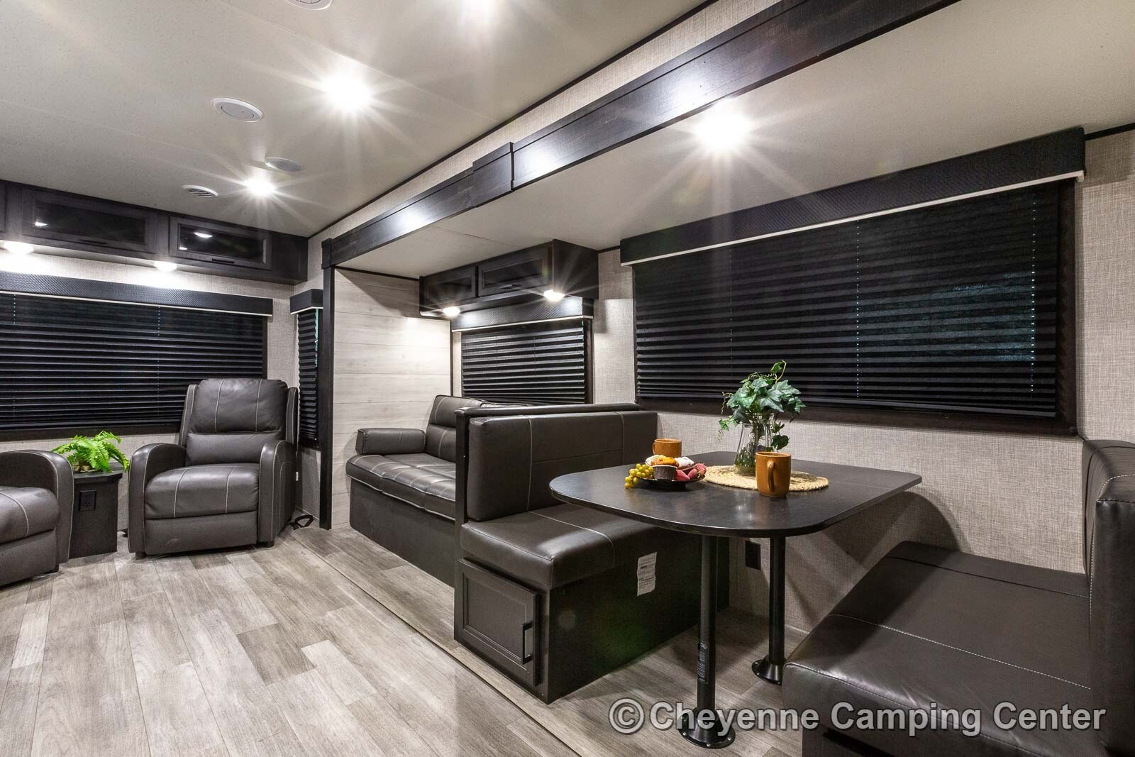 In the rear living area, you’ll find two reclining chairs, a jack-knife sofa, and a booth dinette positioned for comfort and extra sleeping when needed. The slide-out expands the main living space, giving you plenty of room to move around without feeling cramped.
