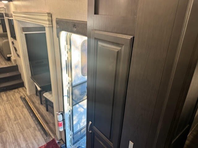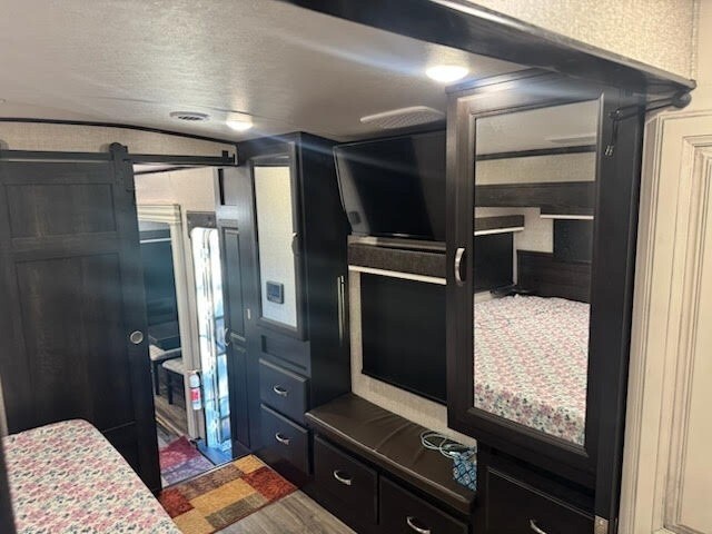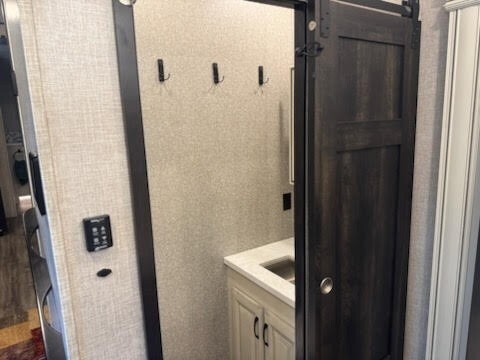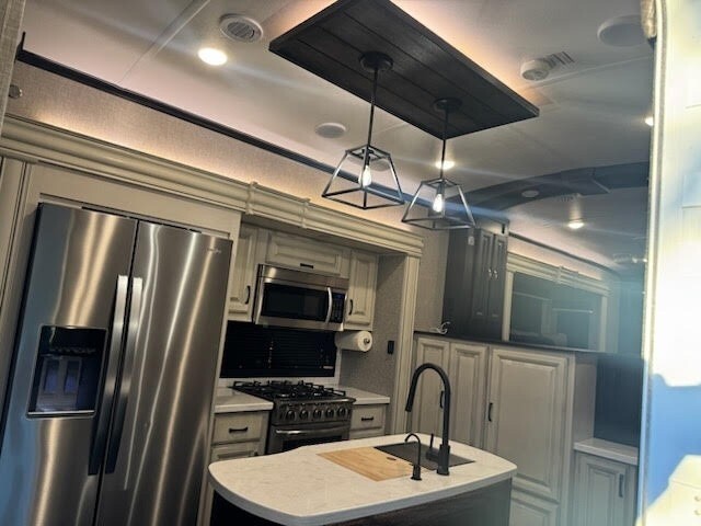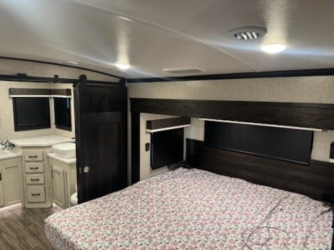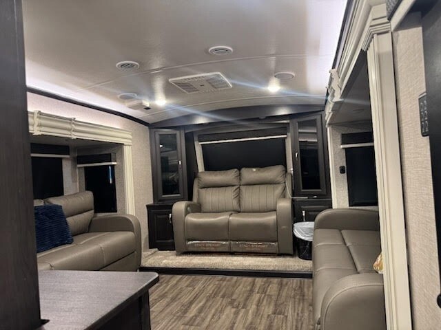Outside, you’ll find dual power awnings (28 ft total), 5 solar-charged batteries, 3 propane tanks, hydraulic auto-leveling, and 360° view cameras for easy setup and safety. Other premium touches include Winegard connectivity, electric roof vents, water filtration, and central vacuum.