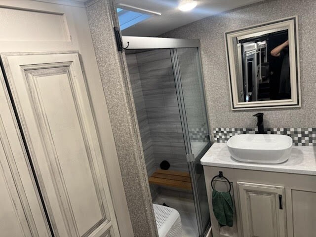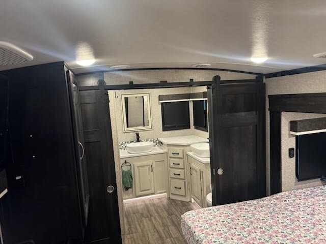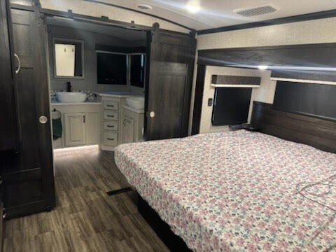 The master suite features a king bed, full-sliding door for privacy, and a rear bathroom with a large shower, dual sinks, and porcelain toilet.