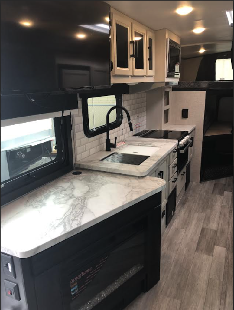 Outdoor living is taken to the next level with the fully equipped outside kitchen, featuring a dedicated exterior refrigerator and griddle-perfect for entertaining, tailgating, or keeping cooking aromas outdoors while enjoying the fresh air.