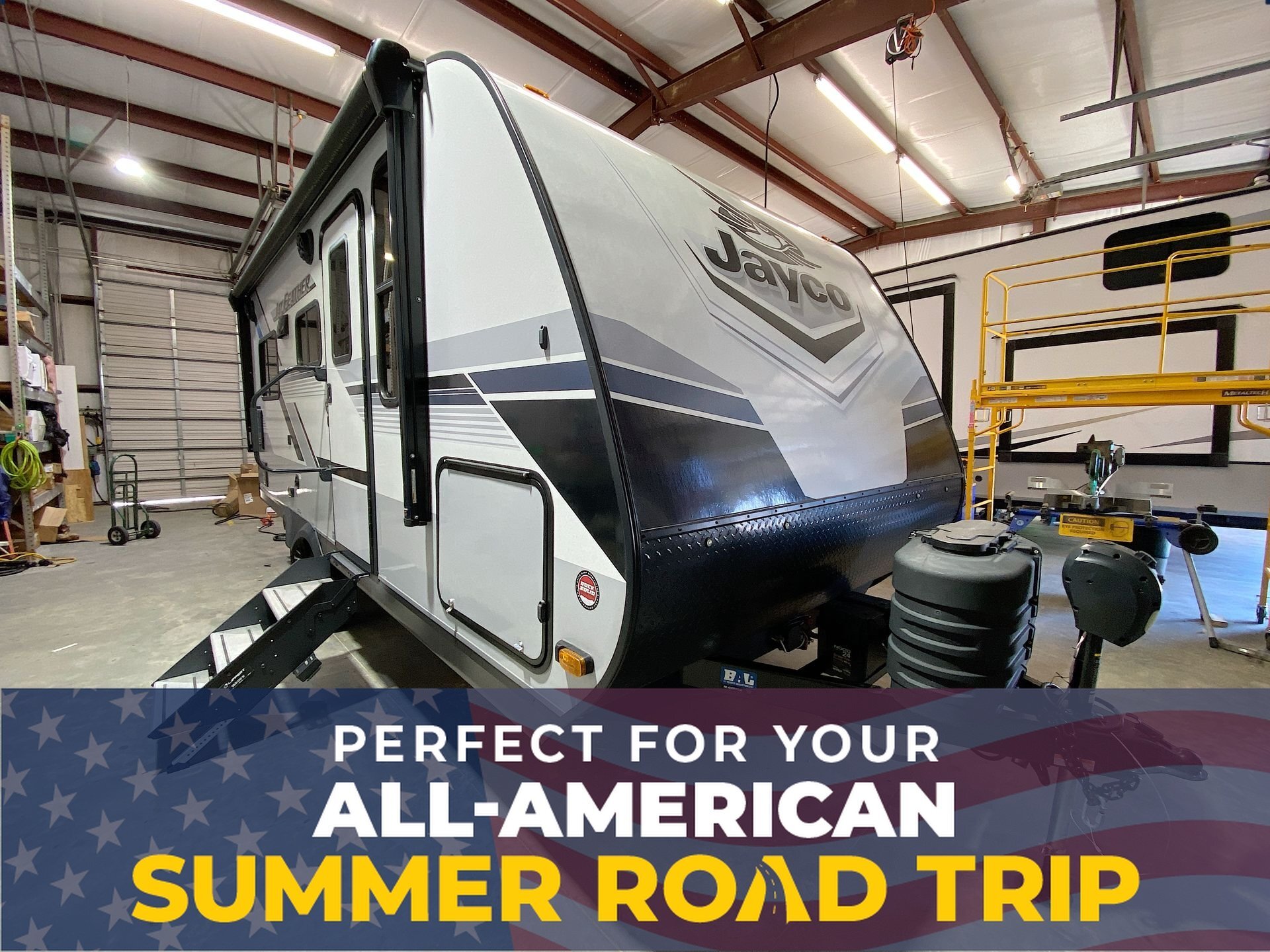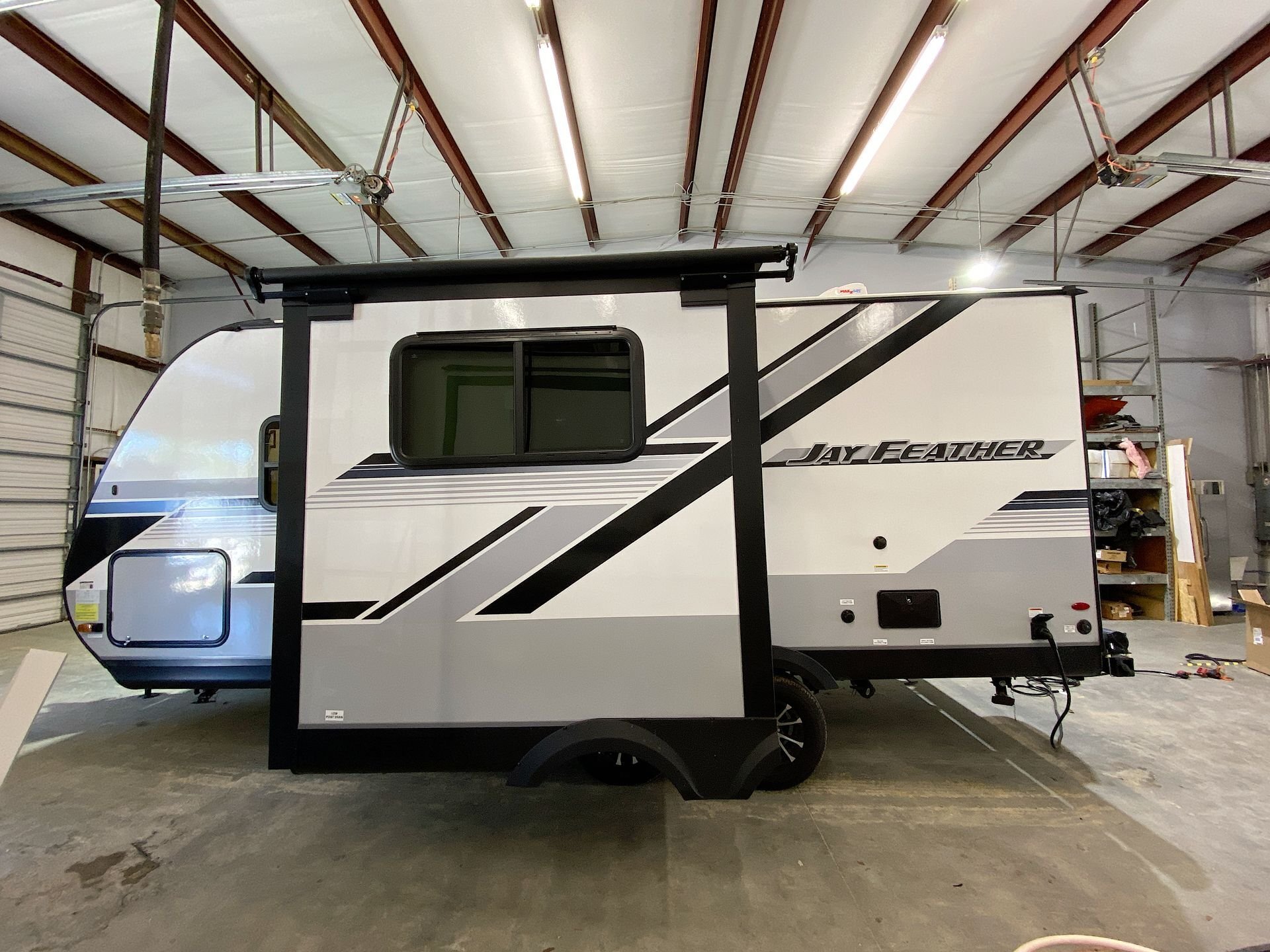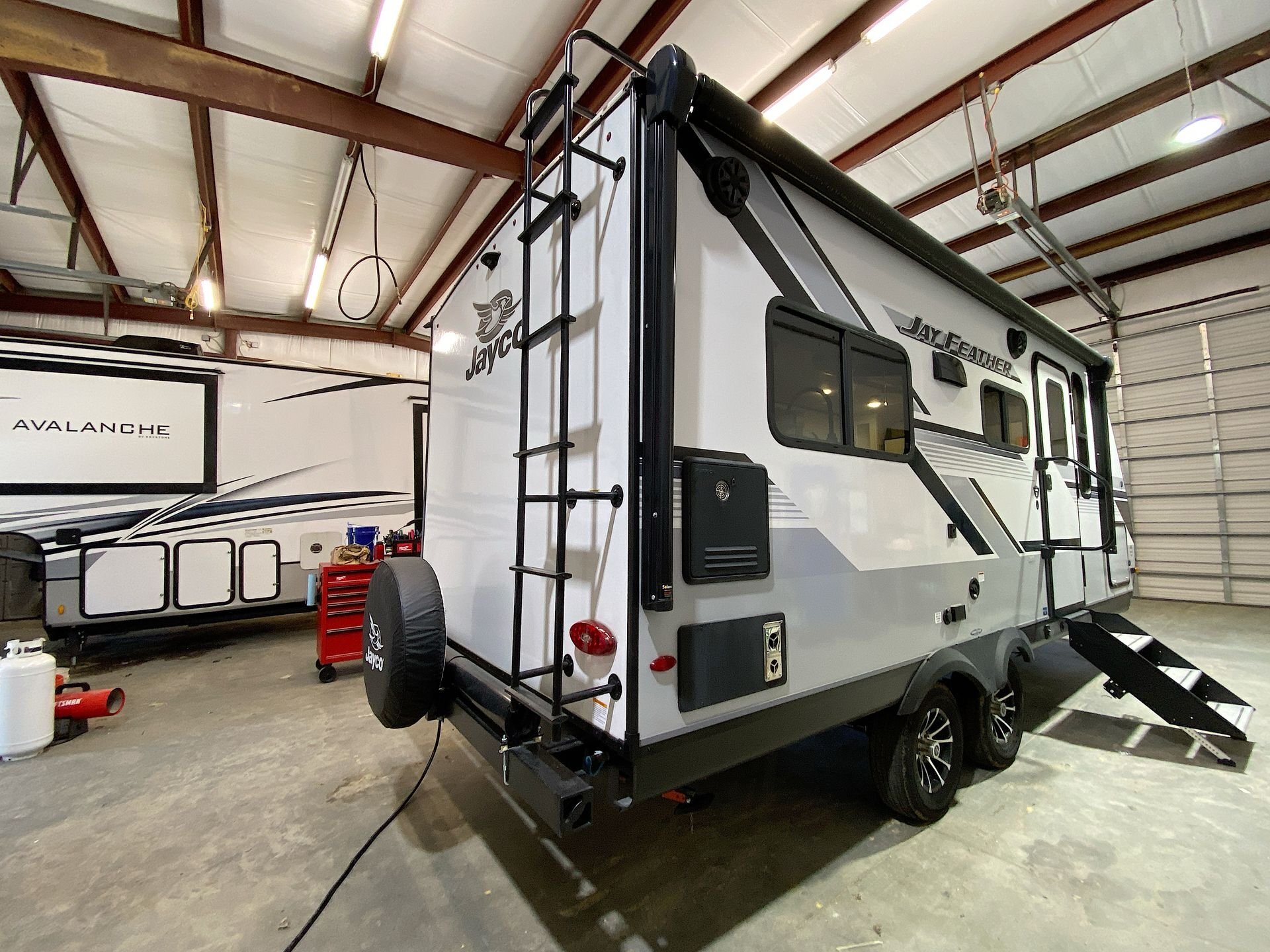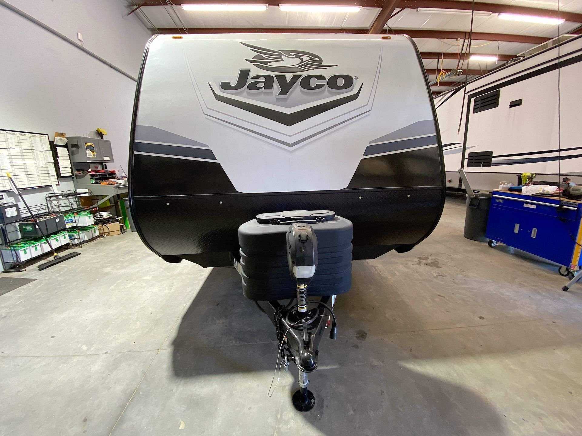 With any Jay Feather travel trailer by Jayco, you will enjoy lightweight towing, convenient exterior amenities, and at-home comforts inside! The Overlander 1 Solar Package included within the Jay Sport Package comes with a 200W solar panel and a 30-amp digital controller so you can enjoy some off-grid camping. There is also a modern graphics package with a dual-colored sidewall, LCI Solid Step fold-down aluminum tread steps on the main entry door, and Climate Shield 0 -100 F tested weather insulation package that will allow you to camp in all sorts of climates. The Customer Value Package will make time outdoors easier than ever with an outside shower, a power tongue jack and a Rock Solid stabilizer system, plus American-made nitro-filled Goodyear tires with self-adjusting electric brakes. More exterior features include a Keyed-Alike locking system, marine grade exterior speakers with blue LED accent lighting, a Magnum Truss roof system, and the list goes on! And we haven't even touched on the interior comforts, like the residential style kitchen countertops and vinyl flooring throughout, decorative backsplash, handcrafted hardwood door/drawer fronts, and multiple USB charging ports to keep you going!