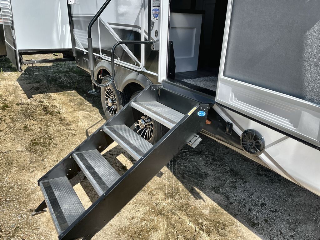 The 2024 Jayco Eagle Fifth Wheel 335RDOK offers a comfortable and convenient travel experience. Designed by Jayco, this fifth wheel combines luxury and practicality to enhance your camping trips.The 335RDOK features a spacious floor plan with a rear living area that includes two tri-fold sofas and theater seating, providing ample space for relaxation and socializing. An entertainment center with a 50-inch 4K Ultra HD Smart TV and an electric fireplace adds to the comfort during cooler evenings.The fully equipped kitchen comes with GE appliances, including a 24-inch range with edge-to-edge grates, a microwave, and a full-sized refrigerator, making meal preparation easy. The kitchen island offers additional counter space, and the walk-in pantry provides generous storage for your groceries.The dining area features a table and chairs with a bench, creating a comfortable space for family meals. The open layout between the kitchen