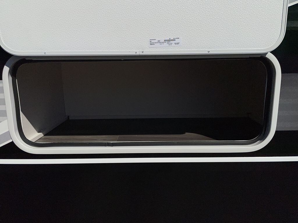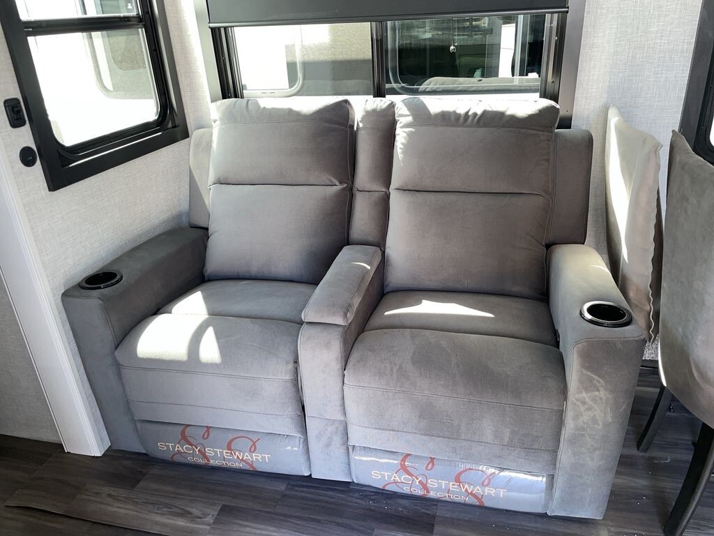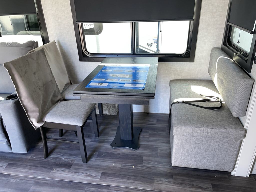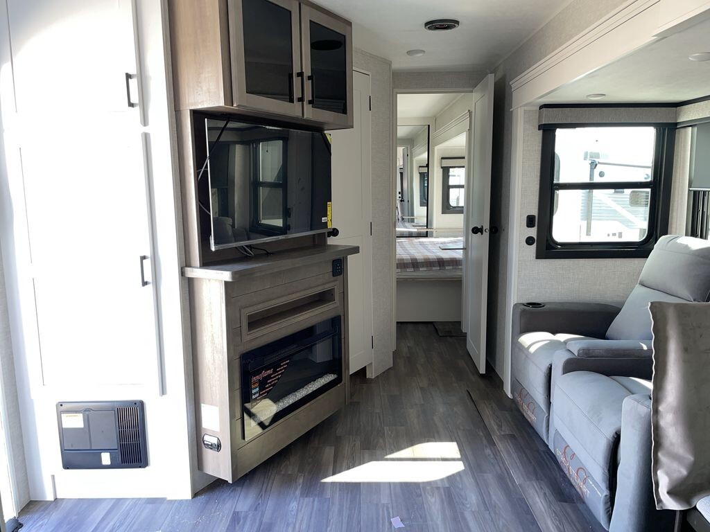 Inside, the front kitchen layout is designed for convenience, featuring modern appliances, generous counter space, and plenty of storage. The spacious living area includes comfortable seating, ideal for family gatherings or entertaining friends. Large panoramic windows allow natural light to fill the interior, creating a bright and