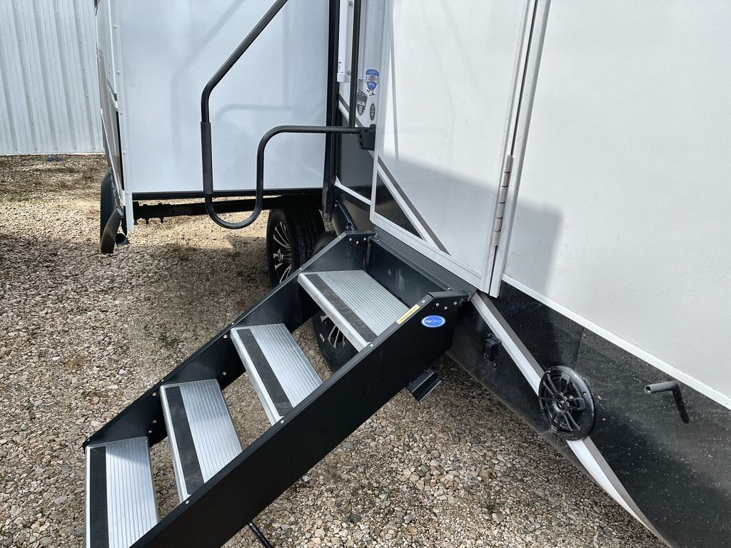 The exterior features a durable aluminum frame with fiberglass sidewalls, ensuring longevity and ease of maintenance. Equipped with a 14-foot power-retractable awning, it provides a shaded outdoor area for relaxation. The trailer's three slideouts expand the living space, enhancing the overall comfort during your travels.