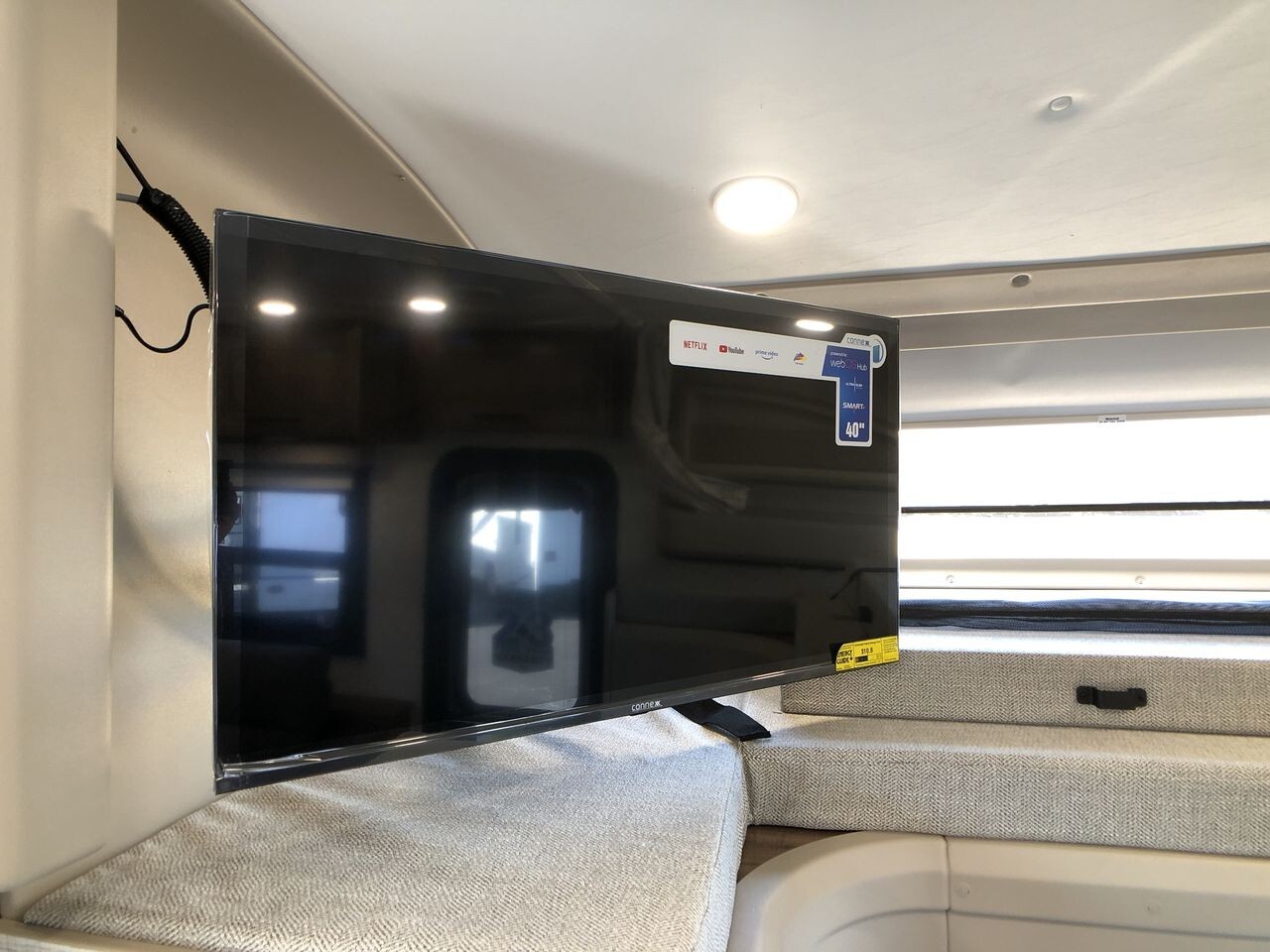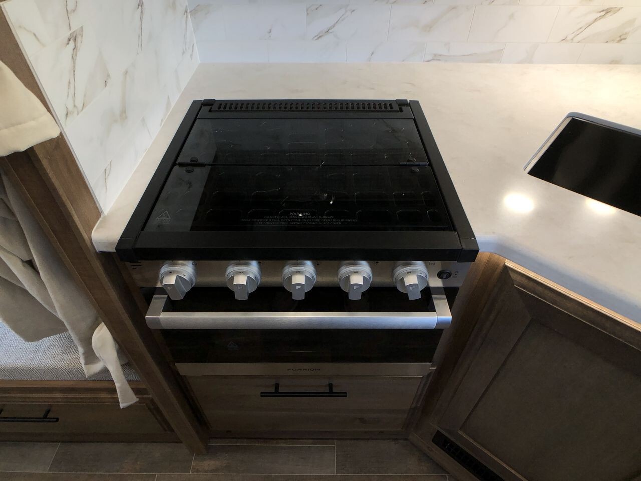 The well-equipped kitchen includes modern appliances such as a 10 cu. ft. 12V refrigerator, Furrion all-in-one cooktop and oven, and a residential-size
