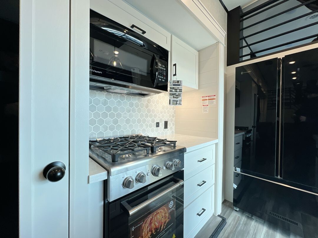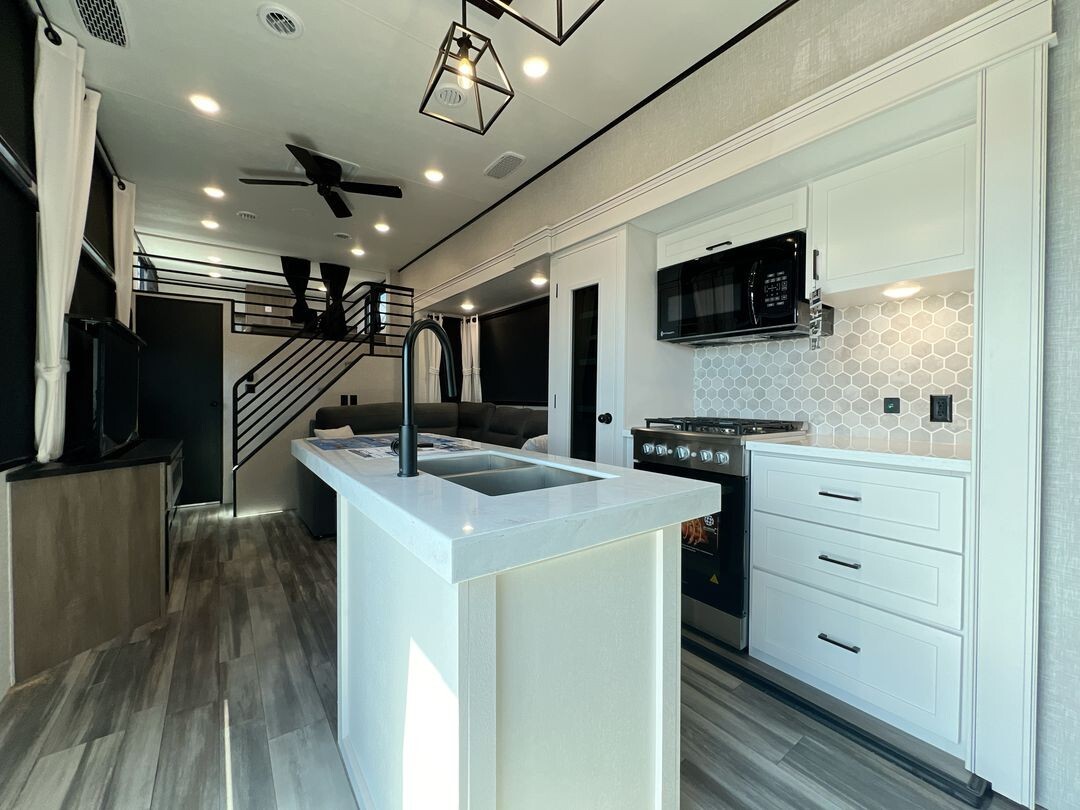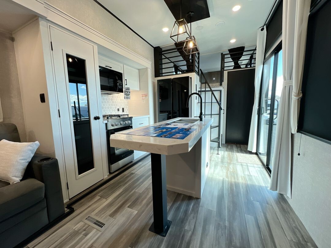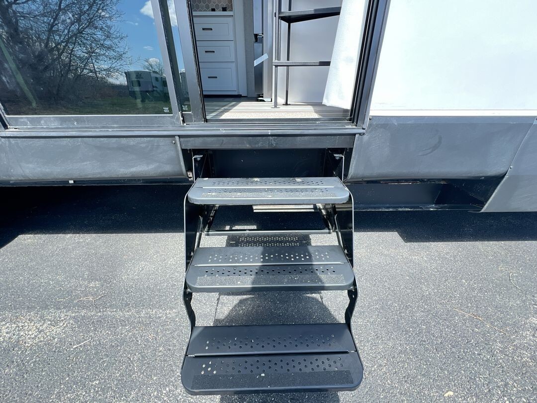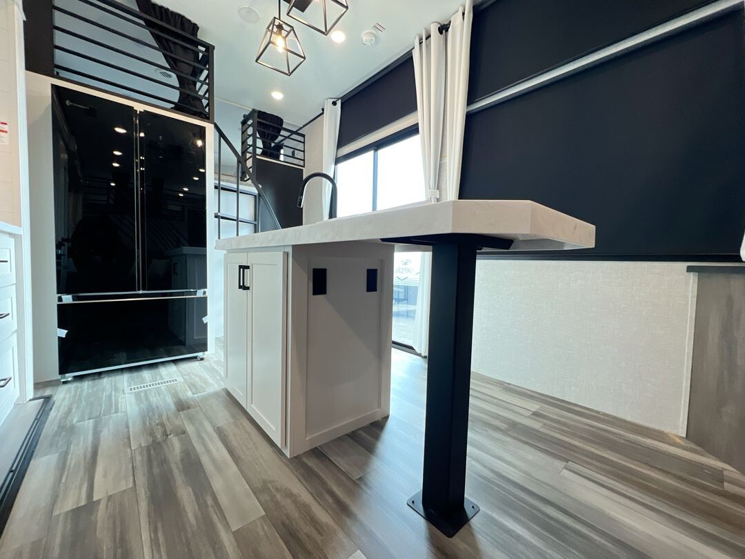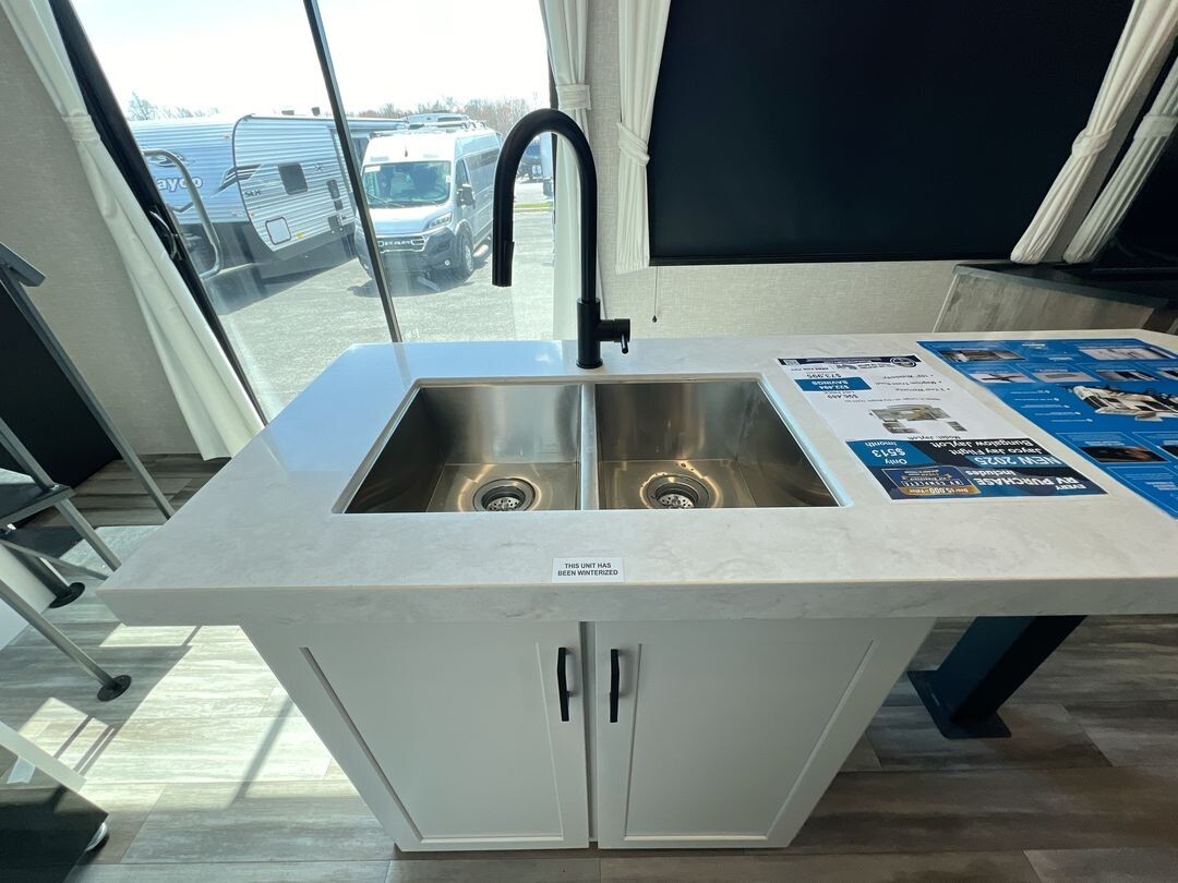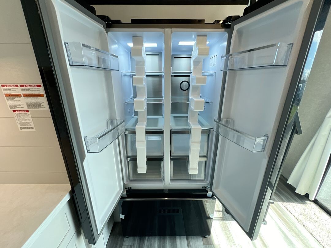 Natural light fills the interior through oversized G20 dark-tinted windows, which also offer privacy and protection from UV rays. The atrium-style front wall with integrated lights adds a touch of elegance to the living area. Enhanced insulation and a