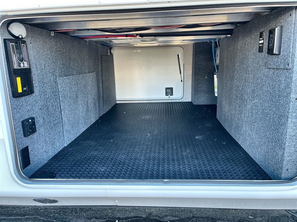 The exterior of the 38KPTS features a sleek design with an aerodynamic front cap, enhancing both aesthetics and fuel efficiency. Constructed with high-strength aluminum and fiberglass sidewalls, this RV is built for durability. It includes two power-retractable awnings totaling 28 feet, providing ample shade and outdoor living space. The large pass-through storage compartments ensure you have plenty of room for all your gear and essentials.