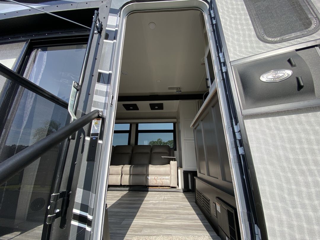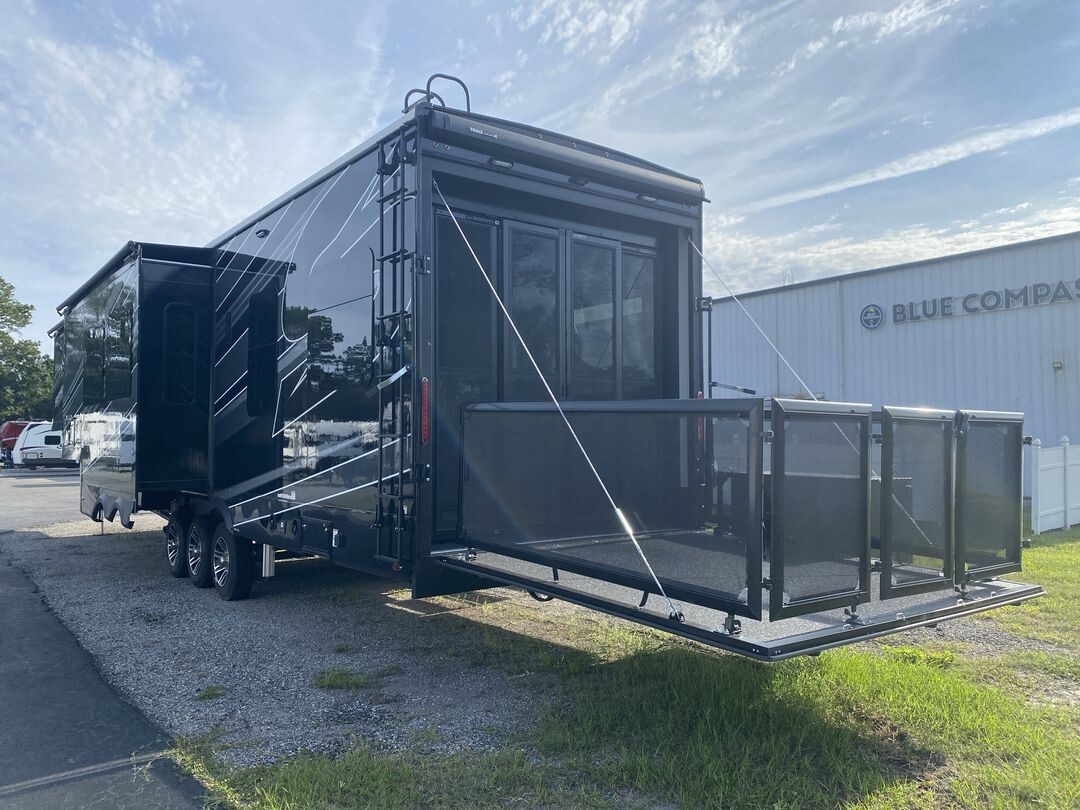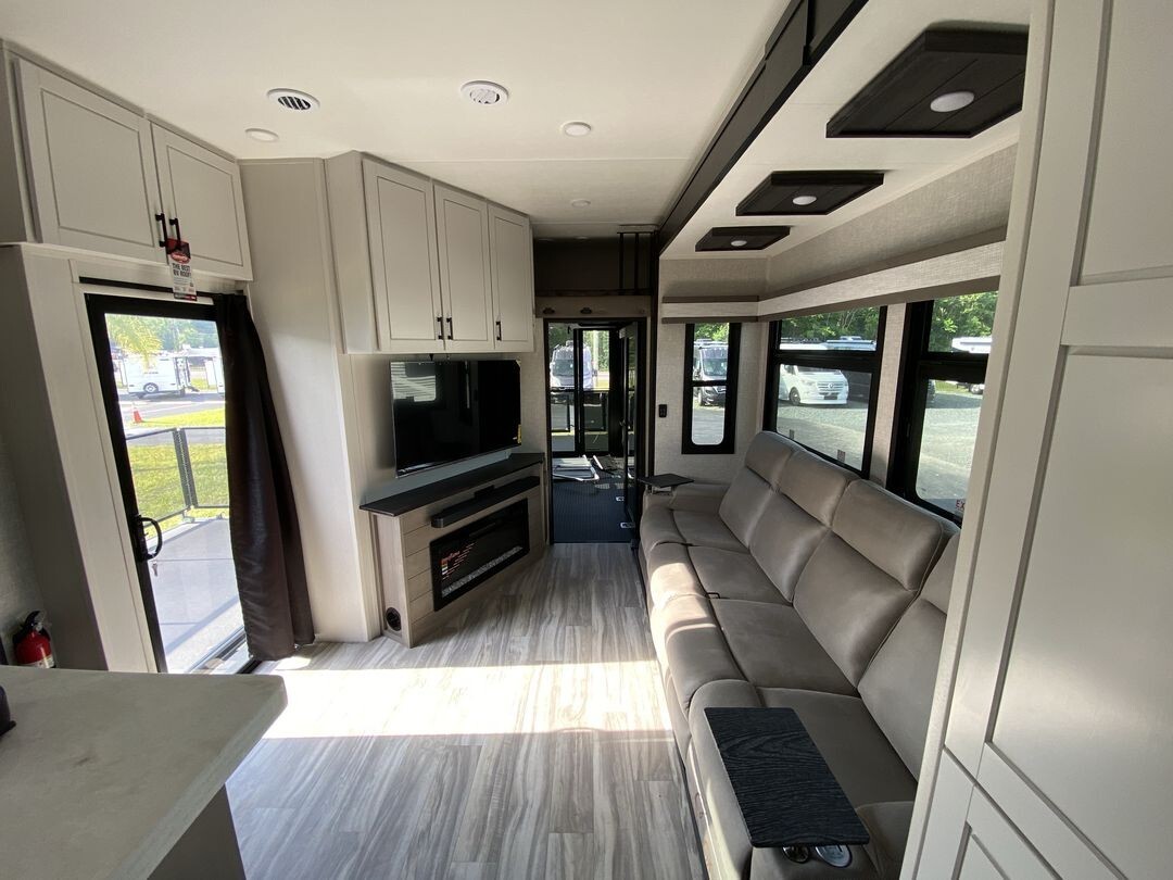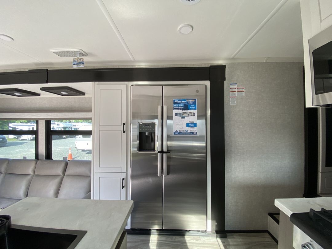The 2024 Jayco Seismic Luxury 4113 is a premium toy hauler fifth wheel that combines comfort and practicality for travelers who enjoy bringing along their recreational gear. This model features a spacious 12.5-foot garage, providing ample room for ATVs, motorcycles, or other equipment. The garage area is versatile, easily converting into additional sleeping quarters or a lounge space, making it ideal for families or groups.Inside, the 4113 offers a welcoming living area with comfortable seating, including a large sofa and recliners, perfect for relaxing after a day of adventure. The kitchen is equipped with stainless steel appliances, a residential-sized refrigerator, microwave, and plenty of storage, allowing for convenient meal preparation on the go.The master bedroom features a king-sized bed with quality bedding and ample storage, providing a restful retreat. Dual air conditioning units ensure a comfortable interior